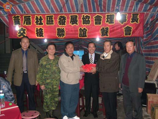 烈嶼鄉黃厝社區發展協會昨日下午舉辦該社區第三屆理事長交接典禮暨聯誼餐會活動,鄉長林金量頒發感謝牌「功在黃厝」予卸任理事長洪木盛,對其不遺餘力落實綠美化之活動,積極推動環境綠美化工作讚美有加。 烈嶼鄉黃厝社區發展協會昨日下午舉辦該社區第三屆理事長交接典禮暨聯誼餐會活動,鄉長林金量率秘書呂合成、各課室主管參加,議員洪成發、洪麗萍、烈嶼守備區旅長栗正傑等貴賓,亦至會場致表關心之意,由社區理事長洪木盛交棒予新任理事長洪國澤,其新任社區幹部為:總幹事洪春暉,總務洪安慶,出納洪添福,會計林玉琪,常務理事莊羨娥、洪植地,理事洪永宗、洪文泳、洪天榮、洪鋒明、陳西坤、洪天興,候補理事洪龍輝、洪炯燦、洪金龍,常務監事蔡秀認,監事洪金安、林秀英,候補監事蔡滿治等人。 會中由鄉長林金量頒發第三屆理事長當選證書予洪國澤理事長,並頒發感謝牌「功在黃厝」乙座,予前理事長洪木盛;鄉長林金量致詞時,表達黃厝區發展協會亦為本鄉模範社區之一,社區非常重視並落實綠美化之活動,積極推動環境綠美化工作;黃厝社區發展協會參加全縣93年補助社區環境綠美化成效考評,即縣長李炷烽於94年2月18日率各鄉鎮長及各局、處、所跨海蒞抵黃厝等社區發展協會進行補助社區環境綠美化成效考評,黃厝社區發展協會勇奪「鄉鎮獎」,獲頒新台幣16萬獎金,金門縣政府於94年3月12日利用金門縣環保公園舉行千人種樹活動中,榮獲表揚為績優單位,94年度社區各項業務亦是屢獲佳績,洪理事長、幹部及社區居民功不可沒,理事長洪木盛凡事以身作則、任勞任怨,更是「功在黃厝」!希望經驗持續傳承與分享,社區更進步與發展,亦更加凝聚社區自主、互助等之美德及發揮團結意識,創造更優質的生活空間,讓烈嶼整體榮景更上一層樓。 黃厝社區發展協會理事長洪木盛特別感謝林金量鄉長與呂合成秘書時常親自至社區發展協會指導、協助與關心,及幹部、居民們努力配合,其為社區與鄉內永遠之志工,新任理事長洪國澤表示,擔任社區幹部職務,是一種榮譽,亦是責任加重,付出更是重要,希望在洪理事長良好之傳承與指導下,社區業務能更加蒸蒸日上。