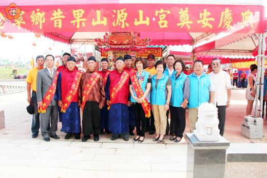 金寧鄉昔果山源山宮重建竣工奠安慶典活動昨日熱鬧展開,縣長陳福海、議長洪麗萍及鄉長陳成勇等地方首長相繼前往獻匾致賀,廟內香煙繚繞、廟前戲台鑼鼓聲響個不停,源山宮人氣十足,場面熱鬧。 奠安為昔果山大代誌,全村總動員以「家有喜事」的心情投入參與慶典活動,廟宇和村內張燈結綵,喜氣洋洋。昨日凌晨起鼓、掀樑之後,熱鬧展開一連兩天的慶典活動,源山宮奠安管理委員會並組成迎賓隊伍,在熱鬧的鞭炮、鑼鼓、樂隊聲中,身著長袍馬褂的族老帶領奠安委員會工作人員,以及鄉親浩浩蕩蕩的在村口處迎接前來參與祭典的賀匾有金門縣長陳福海、議長洪麗萍、金寧鄉長陳成勇及金寧鄉民代表會主席陳成泉等來賓,沿途中,受到村民的熱情歡迎,顯示源山宮信眾對慶典的重視與傳統的禮節。 昨日一大早縣長陳福海率領縣府處室主管於上午八時三十分前往源山宮敬祭,源山宮奠安管理委員會組成歡迎慶賀團迎接,陳縣長遵循古禮行三獻禮,並敬獻「護國佑民」大紅賀匾,祈祝眾王爺庇佑地方安寧,也敬獻爐敬金,表達道賀之意。議長洪麗萍也率議員許華玉、楊永立、王碧珍、張雲德以及議會主管前來敬祭,並敬獻賀匾、爐敬金道賀,受到奠安委員會歡迎。 一個上午,各界首長、民意代表絡繹不絕的前往敬祭道賀,包括,金寧鄉長陳成勇也和金湖鎮長蔡西湖及金城鎮公所主任秘書與金寧鄉公所課長前來敬祭,並敬獻「保我民安」賀匾,金寧鄉民代表會主席陳成泉在各代表陪同下前往敬祭,並敬獻「保境佑民」大紅賀匾及爐敬金道賀,各鄉鎮代表會也由陳成泉代表敬獻「靈佑昭顯」賀匾表達道賀之意,祈求眾神明護佑村民平安、順遂,受到源山宮奠安委員會及村民的歡迎。 來自各地的信眾也絡繹不絕的到源山宮拈香致敬,禱佑闔家平安,廟內沸騰的人聲和鞭炮聲,渲染慶典的熱鬧氣氛。絡繹不絕的敬賀團和信眾,讓昔果山聚落整個沸騰起來,源山宮內香煙繚繞、和「人氣十足」,鞭炮聲響個不停,整個村落,洋溢著喜慶的熱鬧氣氛。 該奠安委員會也辦桌宴請各界來賓以及返鄉的鄉親,並聘請繡花歌仔戲團跨海蒞廟演出傳統歷史劇等多齣精彩戲碼,炒熱廟會的氣氛,奠安委員會歡迎鄉親相招來看戲。