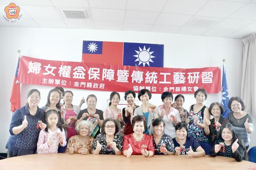 金門縣婦女會舉辦的傳統手工藝「佛祖冠」製作研習活動,吸引許多婦女朋友熱情參與,進行五個週六計十五小時後結業,理事長許華玉樂見學員精心完成的佛祖冠作品,對於繞線編結這門民俗工藝都表示十分珍惜,並且透過研習活動進行,讓這項特別的閩南習俗能代代傳承下去。 金門縣婦女會舉辦的傳統手工藝「佛祖冠」製作研習活動,於十月一日至十月廿九日每週六上午假國民黨金門縣黨部二樓會議室進行研習,共計十五小時),邀請對於地區傳統技藝有深入研究的莊招治老師傳授教導,許多婆婆媽媽們把握假日時間前往參與,聽取莊招治老師解說製作佛祖冠的技巧,學員們原以為製作簡單,但實際投入研習才體會不容易,像是葉片的裁剪弧度、彈性絲線的纏繞密度、還有銅線的粗細軟硬等等,都馬虎不得,一纏一繞都需要細心和耐心,要常常做、多多做、纏繞纏繞再纏繞,功夫自然能到位。對於繞線編結這門民俗工藝都表示十分珍惜,並且透過研習活動進行,讓這項即將消失的傳統手工藝能代代傳承下去。 許華玉介紹,吉仔花用於婚嫁迎娶、喜慶和喪禮,年輕人較陌生的「春花」,俗名「春仔花」,春節時,供桌上會放置隔年飯,並於飯上插上紙製的春花,意取「春飯」,與閩南語「剩飯」同音,有「年年有餘」之吉祥意。家中有嫁娶喜事時,婦女也會在頭上插上「春花」,具有財糧皆「剩」,事事如意,年年有餘之意。 許華玉說,「佛祖冠」,則是金門地區居民會於春節前進行家中大掃除。並會選擇吉日將家中供奉之佛祖進行清潔工作,並更換「佛祖冠」,近年來工商社會進步,很多人改用穿珠之物替代,傳統技藝逐漸式微。 許華玉指出,「吉花」、「春花」、「佛祖冠」等這些傳統的手工花,現在很多都已經失傳了,婦女會的姊妹們,也是花費很多精神,才又重新學會,讓這項特別的閩南習俗能代代傳承下去。