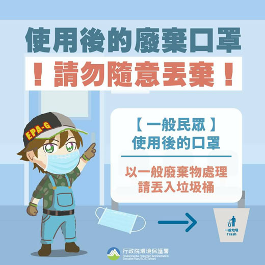 因應新冠肺炎疫情,民眾自我保護意識抬頭,口罩現已成為不少人出門的標準配備,也造成使用後的口罩數量大增,一些人隨意丟棄使用後的口罩,不只導致環境髒亂,也可能形成病菌的溫床,環保局提醒,一般民眾使用後之口罩視為一般廢棄物,應丟入垃圾桶妥善收集處理。 新冠肺炎全球疫情升溫,民眾遵守規定進入醫院診所均戴口罩,但離開後卻隨手一丟,病菌可能隨著亂丟的口罩散播,反而成了防疫死角,環保局表示,將針對醫院、診所、學校、機場及公車站等易丟棄口罩場所加強稽查,並請管理單位提高垃圾清理頻率或評估增設口罩收集桶,另任意丟棄口罩已違反廢棄物清理法第27條規定,最高可處新臺幣6,000元,呼籲民眾不要貪圖一時方便隨意棄置垃圾,以免受罰。 環保局再次提醒,使用後的口罩不亂丟是基本公德心,應丟置到垃圾桶裡,統一保管清理,請民眾發揮公德心,並要常用肥皂洗手及養成正確的洗手方式,共同為防疫努力。