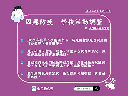 新冠肺炎國際疫情持續擴大,台灣確診案例不但破百也持續增加,為維護學校師生健康安全,縣府教育處昨再和地區國中小校長、幼兒園園長進行線上調查,最後因應防疫,除了學校活動略作調整,也決議「暫停地區學校赴台和出國校外教學與畢業旅行活動,由4月30日延長至本學期止。」 教育處指出,其他事項則維持3月1日公告,至於相關調整公告包括:赴台相關研習、會議、競賽活動,交由各校自主決定,並請各校做好風險管理與應變機制,以維護師生健康。 各校校內或金門地區跨校活動,請各校考量活動性質、參與人數,做好風險控管、溝通對話與應變計畫,以決定活動辦理形式、延後或取消活動。相關校務活動之辦理形式,教育處將視疫情狀況動態檢討修正,以落實校園防疫。 另因應疫情增溫,縣府在提升防疫措施考量下,也決議室內體育場館閉館十二日,本縣含縣屬學校室內體育場館及游泳池,將於3月30日至4月10日全面消毒,並暫停對外開放,希望全縣運動愛好者,在抗疫最關鍵的這段時間能共體時艱,多加使用室外運動場,以維全體縣民健康。