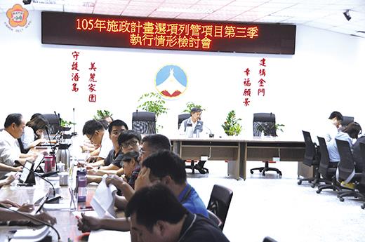 金門縣政府昨日召開104年度暨105年度第2次主管會報指(裁)示事項執行情形檢討會,由縣府參議翁自保主持;會中,逐案進行檢討和由業管部門補充說明後,翁自保表示,能結案的就簽請結案,而賡續列管案件,也請業管部門繼續加速推動執行。且縣長重視施政計畫推動和民生息息相關,各單位應掌握進度並加速推動來讓縣民有感。 檢討會昨日上午九時起,在縣府大禮堂會議室舉行,各業務主辦相關局處副主管和業管單位承辦人員出席參加,並依序提出補充說明或執行情形檢討報告。 承辦單位行政處報告說明,本季列管主管會報指裁示事項計有43案。104年度主管會報指裁示事項賡續列管案14案、105年度賡續列管案29案;經105年8月17日府行研字第1050063340號函請各主辦單位就業管事項清查及加速執行,各單位填報最新執行情形,復經行政處彙整後於105年10月5日統一簽請解除列管者104年1案,105年21案,截至104年度尚有賡續列管案14案,105年29案。 行政處指出,按縣府主管會報指裁示事項應於每季檢討乙次,本次經統計104年度賡續列管案14案,105年度29案。