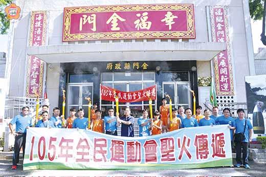 105年全民運動會11月5日起至9日將在台中登場,全民運聖火也於早先引燃,並於本月24日起展開為期8天的聖火全國傳遞,將全民運精神傳遞到全台22個縣市,期待透過水與火的結合,凸顯全民運凝聚與融合的意義。 今年全民運傳遞聖火團隊,24日起分為南線及北線二路繞行全台灣,昨26日繞行金門,一早教育處長李文良即率金門接引團隊,在縣府大門口迎接全民運聖火的到臨,上午9時30分許,全民運傳遞聖火團隊緩緩跑進金門縣政府,隨後將聖火傳遞給金寧中小學七名選手,正式宣告105年全民運動會聖火傳遞開始繞行金門,展開聖火環金傳遞之旅,將象徵和平、光明、團結、友誼的聖火環繞全島。 教育處長李文良表示,105年全民運動會將於105年11月5日至11月9日,共5天在台中市舉辦,參賽單位包含全台灣22個縣市。比賽種類計有第一類14種:健力、拔河、輕艇水球、巧固球、合球、水上救生、蹼泳、飛盤、滑輪溜冰、滾球、沙灘手球、原野射箭、柔術、定向越野;第二類7種:傳統體育(民俗體育、太極拳、元極舞)、創意球類運動(槌球、木球、地面高爾夫、躲避球)、龍獅運動、沙灘角力、舞蹈運動、慢速壘球、劍道等。本次金門縣共70人組隊參加6項活動,包括木球、武術、太極拳、慢速壘球、水上救生、運動舞蹈等。 結束金門繞行行程後,全民運傳遞聖火團隊也將轉往連江與澎湖,預計於31日返回台中市政府,11月1日至3日在台中市區繞行後,完成105年全民運動會聖火傳遞行程。 全民運傳遞聖火團隊成員、金門籍的台中大甲文昌國小校長洪文鍊表示,全民運動會每二年舉辦一次,今年,能代表台中市將聖火漂洋過海傳回母親島,感覺特別有意義,回到家鄉,他也希望能把台中人好客,以及聖火象徵和平、光明與團結的友誼帶回來,同時帶動更多人參與全民運。