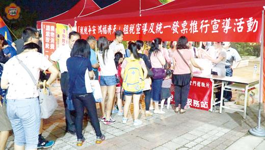 宣導稅賦的重要,建立民眾正確納稅的概念,財政部北區國稅局金門稽徵所於昨(二十七)日晚間辦理一場「二○一六年‧稅稅平安‧鴻福齊天」租稅宣導及統一發票推行宣導活動,現場多個稅捐單位的攤位,憑發票兌換精美小禮品,也吸引許多民眾前往參加,而整場活動在棠風舞蹈團的精彩演出下,圓滿結束。 這場租稅宣導及統一發票推行宣導活動,於昨日晚間六時起,在金門縣文化局前廣場舉行,金門稅捐稽徵所透過邀請棠風舞蹈團以及宣導攤位的活動,並且邀請金門縣政府財政處、金門縣稅務局、福建金門地方法院檢察署、金門縣警察局等單位共同設攤,也吸引大批民眾陸陸續續前往,了解各項稅捐的重要。 昨日的這場宣導活動,各單位備有精美宣導品,供民眾闖關領取,而主辦的金門稽徵所方面,也準備有多項精美宣導品,計有史努比湯杯及保溫保冷袋等精美實用好禮,讓民眾只要憑著發票就可以兌換領取,前往兌換的民眾也是相當踴躍。 金門稽徵所主任石文興表示,統一發票為國家財政的根本來源,但是地區有許多商家對於開發票都是比較被動,有些商家時常有大批遊覽車的遊客造訪,或是可以刷卡等情況,但是卻都沒有發票,這方面是需要改善的,他也呼籲民眾,購物時記得向商家索取發票,如未給予的話可以向各縣市的稅捐稽徵單位投訴。 近年來政府極力的推廣電子發票,石文興說,統一發票的開立,一年約要發出八十億張,約要砍掉八十多萬顆樹木,但是經過數年的努力,目前一年約開出五十萬張電子發票。而電子發票的好處,除了節能減碳之外,也可以利用載具歸戶,並可以指定轉帳的帳戶。日前地區加油站有民眾發票開出一千萬獎金,但至今尚未領取,如果民眾是採用電子發票的話,未來只要中獎,不論是小到兩百元,或大至一千萬特獎,都可以直接轉入指定帳戶,也可以免除保管發票的麻煩。