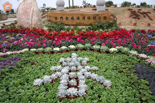 金城海濱公園喜迎「春」! 金門縣養護工程所為與鄉親共同歡渡春節,特別精心打理設計金城海濱公園,花海、綠樹,滿園春色,一片喜氣。 養工所表示,金城海濱公園自去(九十四)年一月起由該所負責管理,為增添過節氣氛,該所員工全體動員,藉由「滿園春色迎新春」的花海造景活動,向鄉親拜年,也希望提供鄉親新春另一個休閒去處。 一入公園,由花海排列成的斗大「春」字笑迎鄉親,讓金城海濱公園春色更濃。另外,由各色花卉組合成的「新年快樂」等吉祥賀詞,包括:「萬紫千紅迎新春」、「花團錦簇慶團圓」、「三星報喜」、「喜橋盈馨」、「柳暗花明又一春」、「新春行大運」、「五福臨門」、「年年有餘」、「海天一色花常開」,羅列在公園四周,相互爭豔,絢爛非常,流連美麗花間,坐看山光水色,沾沾新春喜氣,快意十足。 面積達三點四公頃的「金城海濱公園」,座落在浯江溪出海口處旁,緊臨福建省政府,該公園原本是堆置垃圾的地方,髒亂異常,在縣府巧手打造下,結合親水功能、濕地保護、紅樹林育種等構想,於民國八十九年間,成功規劃打造出這座美麗的海濱公園。 沿著公園堤岸賞景步道,鄉親可飽覽浯江溪口潮間帶的紅樹林豐富自然生態,潮間帶上,有彈塗魚、招潮蟹及貝類(文蛤)等潮間帶生物,周邊海域,則為鷸科鳥類最大渡冬區,鷗科、喜鵲、鸕鶿、紅嘴鳥、赤足鷸時有所見,週邊海域海岸線十分優美,是金門賞景、休閒最佳地點。 金門縣養工所指出,為改善園區景觀,於94年接辦養護初期即投入重點改善工作,值此歲末隆冬,為提供鄉親一處過年遊賞、休憩的好場所,該所經一個月籌劃佈置,營造妝點出歡度春節的喜氣氛圍,歡迎地區家家戶戶新春期間闔府光臨遊賞。