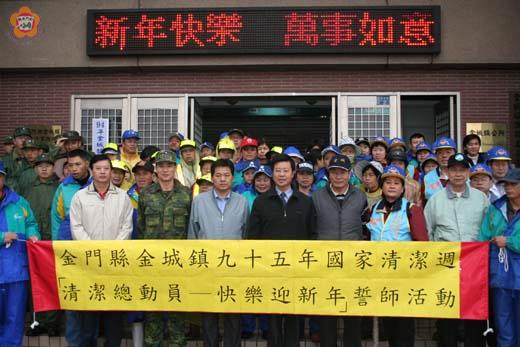 配合國家清潔週起跑,地區五個鄉鎮公所昨日上午八時三十分同步舉辦「清潔總動員、快樂迎新年」誓師大會,縣長李炷烽強調,維護家園環境應是日常生活中就要做的事情,只是透由這項活動來呼籲鄉親一起共同為整理家園環境付出一份力量,讓金門的家園,乾淨加上美麗,成為名副其實的美麗之島。 隨著農曆新年的腳步近了,國家清潔週從昨日起至二十七日展開,全國各地同步投入人力來整頓環境,消除髒亂死角,來迎接新春新氣象。主管金門環保工作的環保局,配合國家清潔週活動,結合地區五個鄉鎮公所昨日上午八時三十分同步舉辦「清潔總動員、快樂迎新年」誓師大會,縣長李炷烽也到場為參與活動的清潔隊員、環保志工以及駐軍官兵「打氣」,感謝他們犧牲假期,帶頭來做環保工作,進而影響鄉親以行動響應環境大掃除,營建更潔淨的家園生活環境,過一個乾淨又健康的農曆新年。 李縣長表示,環境打掃清潔工作,是日常生活中的一部分工作,也是每天必須要做的事,國家清潔週活動,只是要提醒民眾一起為整理家園環境共付出一份力量,具有宣示的意義性。他呼籲全體鄉親自動性維護家園週遭的環境整潔,為建構金門美麗之島來努力。 李縣長期望鄉親共同打造乾淨的生活環境,也能一起努力來淨化人心,改善現今許多不良的社會風氣,促使社會更和諧、溫馨。 李縣長也帶領環保局長楊水森、金城鎮長蔡輝詩、鎮代會主席陳天成以及參與活動的人員共同宣示環境宣言:「我願從自身做起、發自內心,時時刻刻致力於維護本縣環境整潔。在工作,恪盡自我本分,消除髒亂環境,維護縣容整潔。在生活上,落實儉樸生活,減少製造垃圾,資源永續利用。在人群中,宣導環保理念,呼朋引伴,共同投入環保工作。願金門環境品質向上提升,願金門美麗環境成為人間淨土。」,期待全民一起展現執行環境清理工作之決心。隨後,參與金城鎮環境整理的人員兵分多路展開清理髒亂工作。