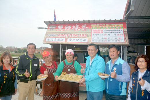 金寧鄉公所配合疫情防疫工作,雖然取消辦理4月中旬2020石蚵小麥文化季活動,鄉長楊忠俊並沒有中斷石蚵產業的行銷工作,邀請縣長楊鎮浯、鄉代表、村長一起到古寧頭蚵村推銷鮮美無污染的石蚵,推薦在地商家的蚵嗲、蚵仔煎、蚵仔麵線的美味特色美食,大夥歡迎鄉親、遊客多多捧場,一起為金寧鄉觀光打拚。 金寧鄉公所連續辦理十七年的石蚵小麥文化季,每年吸引上千遊客造訪,同時也是推廣金寧鄉在地農特產的最佳場域。今年因應「嚴重特殊傳染性肺炎」疫情,考量2020石蚵小麥文化季活動內容多屬於群聚型活動,參與人數估計超過上千人,擔心有群聚感染的風險,因此,首度取消本年度2020石蚵小麥文化季。 古寧頭蚵村在地商家的蚵嗲、蚵仔煎、蚵仔麵線攤位也因遊客不多,生意極為冷清,業者大嘆苦水。適逢新鮮石蚵產季,鄉長楊忠俊特別邀請縣長楊鎮浯、鄉代表、村長共同前往雙鯉濕地自然中心旁保靈殿前廣場幫忙商家行銷蚵嗲、蚵仔煎、蚵仔麵線的在地特色美食。「雙鯉蠔香」蚵嗲小吃店業者陳美女是古寧頭媳婦,她在保靈殿前廣場設蚵嗲攤位已經很多年,賣的是古早味蚵嗲與蚵仔麵線,陳美女用自家蚵田的石頭蚵、自種的高麗菜,讓更多人都喜愛蚵村在地的小吃。 陳美女熟練的塗上麵粉糊,鋪上飽滿新鮮的石蚵仔和高麗菜等菜料,放進熱油裡炸,一顆顆蚵嗲炸得金黃,現場香味四溢。炸好的蚵嗲端上盤,楊鎮浯縣長、楊忠俊鄉長忍不住先嚐一口,豎起大拇指比讚。在場的金寧鄉民代表陳秀金、翁明惠、李琳瑯、古寧村長李開陣、古寧頭社區發展協會理事長李金鎗、鄉公所主秘蔡世舜、秘書王四川、課長張寶仁、李煜翔等主管一起推銷蚵村的平民小吃。 楊忠俊表示,雖然取消4月中旬2020石蚵小麥文化季活動,但鄉公所推展產業行銷的工作仍持續進行,危機就是轉機,鄉公所將規劃推動觀光工作轉型,創造新的景觀亮點、籌備有別以往的遊程活動、強化網路行銷,俟疫情過後,鄉公所將推出不同觀光活動如農村市集、蚵田體驗等相關活動,期待活絡金寧鄉經濟發展;同時提撥部分經費研發石蚵等農漁特產品,以照顧該鄉農漁蚵民收益。楊忠俊表示,現在是石蚵產量盛產的季節,來到古寧頭一定不容錯過來品嚐好吃新鮮的石蚵料理。另在北山還有一家美食麻花捲,甜而不膩,會人越吃越涮嘴,也等著大家來品嚐。楊忠俊說,等待疫情過後,鄉公所將推出不同的觀光活動,例如農村市集、蚵田體驗等,屆時請鄉親、遊客多多捧場,一起為金寧鄉觀光打拚。 鄉公所提供古寧頭蚵村在地小吃商家,有雙鯉蠔香蚵嗲店,電話:0963-036-385,地址:金門縣金寧鄉古寧村南山1-8號(雙鯉湖濕地中心對面)。三嬸婆蚵嗲,電話:082-312163,金門縣金寧鄉古寧村南山28號。國賓小吃店,電話:0918-617-066,金門縣金寧鄉古寧村北山83號。 鄉公所指出,每年3到5月是金門石蚵、小麥產季。金門石蚵(牡蠣)養殖方式特別,蚵農以花崗岩石條養殖,蚵苗隨著潮來潮往,體型雖小卻入口Q彈有勁的石蚵,當地人稱「石頭蚵」、「珍珠蚵」。每年冬天到隔年3、4月,一望無際滿滿的石蚵田,是旅人必訪景點。 在小麥部分,鄉公所表示,金門土地貧脊只能種植耐旱作物,小麥因而成為金門主要種植作物之一,每年夏初豐收季節,總會看到一片片黃澄澄麥浪,隨風起舞,也成為網美熱門打卡點。