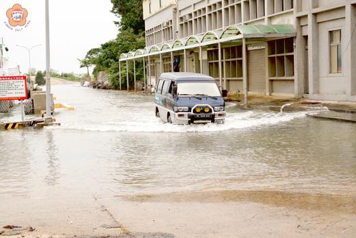 近日適逢大潮,金門各海岸線波濤洶湧,許多沙岸都被海水淹沒,連新湖漁港海平面也蔓延至陸地上,積水嚴重,好似颱風過後般,一輛廂型車深怕進水,趕緊將車駛離漁港,濺起大量水花。另,根據氣象局預報,強烈颱風「海馬」來勢洶洶,雖然應不會掃過台灣本島,但氣象局不排除針對金門地區發布陸上颱風警報,適逢大潮,提醒民眾勿將車輛停在海岸邊或低窪處。