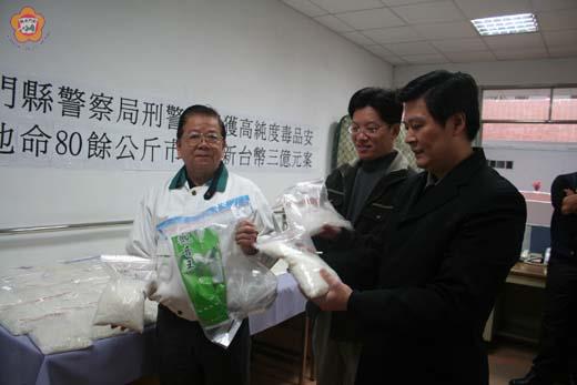 跨年狂歡派對即將來臨,毒梟也蠢蠢欲動,金門縣警察局刑事警察隊昨夜於金沙鎮洋山海域會同金門岸巡總隊,查獲地區歷年來最大宗毒品走私案件,計查獲二級毒品『安非他命』八十餘公斤,毒品市價逾新台幣三億元,全案正由刑警隊循線擴大偵辦中。 副縣長楊忠全獲知警察局刑事警察隊破獲地區歷年來最大宗毒品走私案件,昨日一大早就前往縣警局贈送加菜金為幹員加油打氣,勉勵幹員不畏辛勞查獲此案,警察局與各情治單位做好最嚴密之防堵,不讓毒梟越雷池一步,以杜絕毒害、確保國人健康。 縣警局指出,警察局刑事警察隊於94年10月19日在金門地方法院檢察署檢察官指揮下破獲地區首件『搖頭轟趴派對』查獲嫌疑人40餘名,經數月擴大向上追源,繼而於12月30日晚上俟時機成熟,經警察局刑事警察隊長江守寰分三組派員十三人前往金門地區洋山海域埋伏守候,於上記發生時見毒梟內有船老大一人、挑夫二人坐舢舨靠近岸際涉水丟包,才剛丟包就被發現,大陸客和接應的台灣毒梟藉由值大滿潮利用潮汐脫逃,所留現場物品經帶隊查證為二級毒品『安非他命』約80餘公斤,毒品市價預估為新台幣三億餘元。 落入警網安非他命經清點發現該批走私物品竟是以茶葉袋偽裝包裝之二級毒品『安非他命』計十箱七十小袋,毛重約80餘公斤,警方用美工刀劃破茶葉袋,一包包安非他命馬上現形,警局桌上擺的滿滿安非他命,市價預估為台幣三億餘元,刑警隊目前已掌握有利證據正擴大偵辦中。 金門縣警察局表示,金門位居福建閩江口與大陸沿海近在咫尺,實為我國邊陲重鎮,自民國90年兩岸試辦『小三通』後,經金門往來兩岸三地民眾增多,不肖之徒認交通便利,進出國門方便,遂偶有毒蟲夾帶毒品闖關情事發生,鎮守國境大門之治安單位亦能克盡職守屢將投機分子繩之以法。金門縣警察局為維護地區純淨之環境,近一年來主動佈線查獲地區吸食一、二級毒品者百餘人,更為根絕毒品來源跨海查緝由臺運送入境之上源,及積極佈線蒐集兩岸三地之毒梟毒品走私情資,對肅清煙毒不遺餘力,防止金門淪為毒品轉運站。 刑事警察隊長江守寰呼籲不肖歹徒不要利用金門為轉運站,警察局將與各情治單位做好最嚴密之防堵,不讓毒梟越雷池一步,以杜絕毒害、確保國人健康。