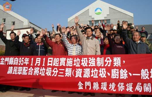 本縣將從明年元月一日起與全國其他縣市同步實施「垃圾強制分類」政策,縣府昨(二十六)日上午在環保局舉行「推動垃圾強制分類誓師活動」,縣長李炷烽帶領參與人員共同發表誓師宣言,呼籲軍民及各單位配合做好垃圾分類與資源回收工作,共同攜手打造美麗新金門!並以環保行銷金門觀光。 環保局昨日上午八時四十分起在該局解說中心辦理「垃圾強制分類」宣導說明會及舉辦誓師大會,會議由縣長李炷烽主持,包括環保署技監陳聯平、環保局長楊水森,及各機關、學校、部隊和社區環保工作承辦人員一百二十多人參加。 縣長李炷烽主持時致詞指出,乾淨環境,讓我們置身其間感覺到舒服,不僅僅是這一代的責任,更是下一代的權利,每一個人都是地球的過客,長則上百年,短則幾十年,都應該愛護我們生活、生存的地球,但隨著社會的發達,各種產業的推動,造成環境的污染,日勝一日,越來越嚴重,過去環境給我們的啟發,大家視若無睹,得過且過,到今天已到了不得不去面對,不得不去解決的時刻。 他說,二年前實施限塑政策,實施以來,至今檢討,結果不理想,購物用塑膠袋仍到處充斥,造成下一代環境的破壞,這是一個前車之鑑。 他表示,推動垃圾減量與資源回收,軍民做好垃圾分類,方便處理,以讓垃圾繼續利用,使大家生活的家園更美好,這項垃圾回收政策是高瞻遠矚,但千里之行始於足下,高遠目標沒有大家內心的改變,沒有大家發諸於行動來力行,會如同限塑減量一樣,最後不了了之。 他說,自94年1月1日起全國已有10個縣市率先實施「垃圾強制分類」政策,本縣將自明年元旦起與全國其他縣市同步推動這項計畫,他強調,如果金門縣做不到,其他縣市更難達成此目標,畢竟金門的環境單純,外來影響有限,人口不多,金門推動這項措施,能達到預期的目標,這也是行銷金門,樹立典範。 李炷烽也有感而發地說,很多活動講求外在有形,無形的內在更重要,他除期許大家一起發自內心,讓金門外在環境改善,而內在心靈的淨化提升,也是刻不容緩。 對於時下社會價值觀,李炷烽也頗有所感觸,他說, 少了真知灼見,很多只是一己利益,情緒性的反彈,許多人游走法律邊緣,只看現在,不見未來,人心道德淪喪,地區的民主發展至此沒有明天。 「除了有外在乾淨,也要有健康的心靈,別人能,金門也能做到!」,不讓以環保著名的新加坡專美於前,李炷烽也鼓勵大家要以宗教家的情懷、慈善家的行動,配合做好各項措施,以達成政策目標。 「垃圾放錯地方是垃圾,沒放錯地方就是資源」,環保署技監陳聯平以此強調資源回收再利用的真諦,他表示,金門過去長期實施戰地政務,地形地物破壞不大,先有國家公園生態環保在先,環保署防制在後,又有縣府的重視與投入,相信金門環保工作絕對會成為台灣各縣市的模範。 隨後縣長李炷烽也與環保署技監陳聯平、環保局長楊水森帶領大家一起宣讀「垃圾強制分類工作誓師宣言」,其內容為「我願為環保理念,從自身做起,發自內心,時時刻刻遵守下列約定:一、力行垃圾減量、分類回收,資源永續利用。二、力行簡樸生活、綠色飲食,減少製造廚餘。三、力行消除髒亂、維護整潔,永保美好環境。『垃圾分三類、環境好OK』,『垃圾全分類、資源零廢棄』,願大家共同攜手打造美麗新金門。」展現軍民落實推動環保的決心。 為因應強制垃圾分類政策之推動,環保局日前已針對第一線之清潔人員進行行前教育,昨日的宣導說明會,並邀請環保署廢管處邱俊雄技士講授垃圾強制分類之政策說明及環保署督察總隊黃仁晞技士講授廚餘回收及再利用,並由已於第一階段率先實施之高雄縣政府環保局分享推動工作之經驗,以有效提升本縣未來實施之成效。