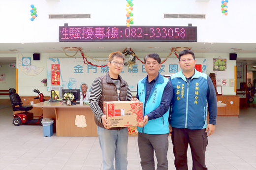 「武漢肺炎」疫情不退,金湖鎮長陳文顧昨日率社會課同仁前往位於金門縣立福田家園、金門縣松柏園老人長期照顧中心、社團法人金門縣身心障礙者家長協會等弱勢族群團體,探視慰問長輩鄉親及身障朋友,表達防疫期間對弱勢的族群關懷,並贈送防疫酒精各一箱作為平時該場所人員清潔、消毒、防護之用,分別由福田家園主任陳長源、松柏園社工組長蔡佳玲、身障家長協會教保員陳月娥等代表接受。 陳文顧表示,由於年長者及身障朋友身體的抵抗力及免疫力較弱,平時亦為慢性疾病所苦亟需社會關心的族群,為關心弱勢族群的防疫權益,希望能盡微薄之力保護弱勢族群不要被遺落在防疫安全網之外。陳文顧並感謝該場所醫護工作人員平時的努力、犧牲奉獻,才能讓家屬安心工作無後顧之憂,同時提醒做到防疫滴水不漏,全面杜絕疫情。