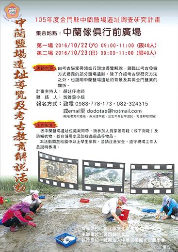 文化局訂於十月二十二日、二十三日辦理「中蘭鹽場遺址導覽及考古教育解說活動」,由國立臺灣大學人類學研究所顏廷伃博士主講,帶民眾認識考古工作,也解說中蘭鹽場遺址發現過程及與金門鹽業關係,歡迎國中以上對活動有興趣者報名參加,每場限額四十名,報名請Email:dodotae@hotmail.com或洽0988-778-173、082-324315吳雅惠小姐。 「中蘭鹽場遺址導覽及考古教育解說活動」,由金門縣文化局主辦,社團法人中華民國國家公園學會執行,訂於10月22日、10月23日將上午9點至11點辦理兩場次。文化局表示,為推廣金門地區考古教育及培訓金門地區專業考古人才,此次由國立臺灣大學人類學研究所顏廷伃博士,以其多年從事考古工作的專業,在承接「中蘭鹽場遺址調查研究計畫」,進行中蘭鹽場遺址發掘的過程中,辦理兩場考古遺址及教育導覽活,並將親自為參加人員現場導覽解說,提供其最寶貴的經驗,帶民眾了解考古遺址,說明中蘭鹽場遺址發現過程,及其與金門鹽業關係。也將透過現場解說帶民眾了解目前發掘現況、考古田野工作方法、遺址價值與重要性和現場參觀注意事項等內容,活動機會難得,除了提供相關工作人員考古專業培訓外,也開放民眾參與,期能成為鄉親認識考古遺址及考古發掘的一扇窗。 文化局表示,活動共分兩場次,分別為10月22日週六(第一場)及23日週日(第二場)上午9點至11點,在中蘭鹽場遺址辦理,集合地點為中蘭傢俱行前廣場,歡迎國中以上對中蘭鹽場、考古遺址及考古教育有興趣的人士報名參加,每場限額四十名,額滿為止。報名時請附姓名、身分證字號、出生年月日等資訊,方便辦理保險。 文化局也提醒,當天請穿著雨鞋(或下海鞋)及防曬衣物,自備用水及防蚊蟲藥品等物品,並注意自身安全,遵守工作人員所說明之注意事項。報名請洽0988-778-173或082-324315吳雅惠小姐,或Email:dodotae@hotmail.com。