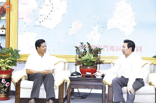 新任金門縣榮民服務處處長葉慶聰,昨日上午前往金門縣政府禮貌性拜會縣長陳福海。陳縣長期望葉處長融入金門,大家共同相互支持來為榮民服務。 葉慶聰昨日上午十一時十五分許,於拜會縣長陳福海時,陳縣長也就莫蘭蒂颱風重創金門的救災和復原、金酒創造金門財政收入、金門教育提升等,進行晤談。