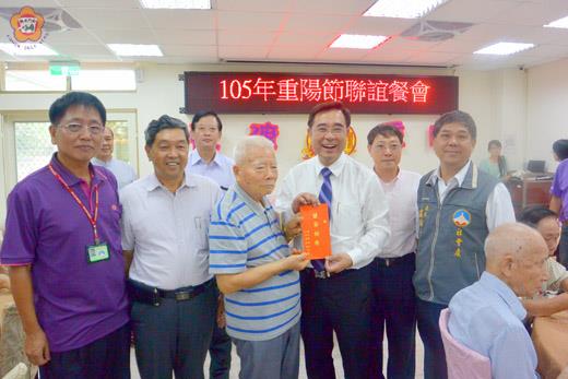 重陽節即將來臨,金門縣長青會為了慶祝九九重陽佳節,特別於日前舉辦「重陽節餐敘聯誼活動」,邀請長青會會員們同樂,一起慶賀佳節愉快。 金門長青會辦理「重陽節餐敘聯誼活動」,於日前晚間六時三十分起,在長青會(金城北堤路上)會議室內熱鬧舉行,縣府秘書許金象、金城鎮長石兆瑉等人也特別到場致意,與長輩們同樂。 代表縣府到場致意,許金象除了賀佳節之外,也祝福全體的長輩們,健康長壽。而鎮長石兆瑉表示,肯定長青會對於提倡社會關心長輩,敬老尊賢所做的努力,並祝賀長輩們佳節快樂。