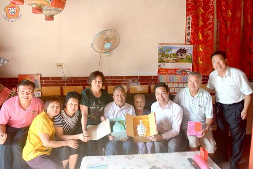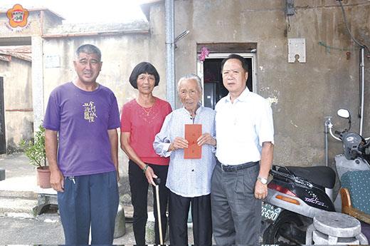 「九九重陽節」,金門縣長陳福海昨日續走訪金湖鎮、金沙鎮,探慰呂陳甜等十七位百齡人瑞,關心日常生活起居,贈送敬老酒,也轉贈小英總統就職紀念酒,陳縣長親切為人瑞長輩戴上總統府致贈的高齡人瑞金鎖片、遞上敬老狀,握著人瑞的手,滿滿的祝福,誇讚好福氣啦。 重陽節前夕,縣長陳福海排開繁忙的公務,昨日下午,由縣長辦公室主任陳永明、縣府社會處處長甯國平等幹部、以及金湖鎮長蔡西湖、金沙代鎮長王登緯的陪同,續走訪金湖鎮、金沙鎮,親自登門向十七位百齡人瑞賀節,在重陽節獻上滿滿的祝福,受到人瑞及家人的歡迎。 陳縣長帶來縣府準備的瓷瓶敬老酒禮盒,也轉贈小英總統就職紀念酒以及金鎖片、敬老狀,人瑞及家人都很珍惜收到這一份珍貴的禮物。 陳縣長親切探慰人瑞長輩,貼近耳旁關心生活起居和身體狀況,關懷之情溢於言表。多位身體還很硬朗的人瑞,認出陳縣長,很開心,還告訴家中的狀況,和陳縣長話家常,洋溢著溫馨情。 陳縣長說,「家有一老,如有一寶」,人瑞真的好福氣,也是家人的福氣,應該好好珍惜這一份福報。陳縣長祝福人瑞長輩健康呷百二!家庭幸福。 陳縣長也垂詢臥床中人瑞長輩的身體狀況,很感佩家人長時間對於親人無微不至的照顧,這一份孝心,令人感動。陳縣長說,有需要縣府協助的地方或是醫療業務的協助,縣府團隊一定會做好服務的工作。 縣府社會處指出,金湖鎮百歲人瑞有李陳名(101歲)、黃秀治(滿百)、陳水治(109歲)、呂陳甜(104歲)、呂吳緞(104歲)、李金柳(滿百)、呂陳羨(106歲)。金沙鎮百歲人瑞:吳陳微(滿百)、陳文宰(104歲)、何玉霜(104歲)、黃莊淑靜(滿百)、楊螺(滿百)、梁勤治(104歲)、黃網治(110歲)、歐陽李束嬌(滿百)、李在(滿百)、陳淮欉(101歲)。