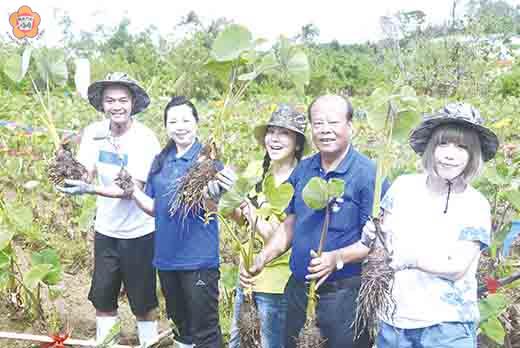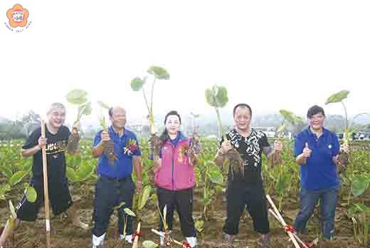 許加泰/圖文 今年的芋頭季,烈嶼鄉長洪成發請來深受歡迎的民視-美鳳有約節目主持人陳美鳳(圖右三)來到芋島,陳美鳳一身輕裝,穿著雨鞋跟著鄉長洪成發、鄉代會主席洪若珊踏入芋園,當一日農夫。陳美鳳介紹土產芋頭生長環境,並體驗採收的辛苦過程。洪成發歡迎各地好朋友一起來親近芋田,也巡禮烈嶼的風土民情、自然生態和戰役遺跡的豐富觀光資源。 這幾年來,烈嶼鄉長洪成發強力行銷土產芋頭,鄉公所每年辦理的芋頭季活動,不僅吸引成千民眾的參與,也吸引國內知名綜藝節目來烈嶼錄製專輯。藝人陳美鳳和助理跟著鄉長洪成發、鄉代會主席洪若珊走進芋田,拿土耙,在土裡挖呀挖,拔出一顆顆飽滿的芋頭。 下過雨的芋田泥濘難行,陳美鳳雖然穿著雨鞋,一不留神,腳還卡在泥濘土拔不出,還得在洪成發的協助下才脫困。陳美鳳有感而發的說,農夫很辛苦,芋農更是辛苦。 陳美鳳和洪成發、洪若珊,手拿著剛從田裡掘起的含葉芋頭,透由鏡頭畫面向各地好朋友傳達烈嶼正值芋頭採收的季節,歡迎各地遊客相招逗陣前來烈嶼吃喝玩樂。