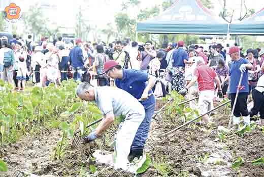 「芋見烈嶼·芋約幸福」的重頭戲-挖芋體驗活動,由鄉長洪成發帶領900人下田,開挖香芋頭,雖然芋田很泥濘,在工作人員的協助下,民眾順利採收的芋頭,免費自行帶回嚐鮮。 挖芋體驗活動,民眾搶著報名,吸引大、小金門和台灣籍民眾的參與,在參加芋頭季開幕式後,由鄉長洪成發帶領下田採收芋頭。挖芋也是媒體人員採訪芋頭季的重點活動,美鳳有約節目團隊、以及駐金各媒體從業人員,在芋園捕捉民眾挖芋的畫面。 儘管芋田泥濘難走,民眾三五成群好友、或是家庭成員一起下田採收芋頭,直呼新鮮。很多小朋友在父母的陪同下,第一次到芋田,先了解芋葉的模樣,更開心挖到泥土下的芋頭。民眾開心拿著現挖的大小芋頭,在芋田中合影留念。也有很多觀光遊客、金大學生相招同學一同參加活動,在芋田玩得很開心。 烈嶼芋頭口感香、鬆、綿,入口即化的品質,遠近馳名,很多遊客從媒體資訊了解到鄉長洪成發辦理芋頭季行銷芋頭,專程來體驗,也品嚐芋頭的美味。旅台金門鄉親很高興能為家鄉芋頭的行銷活動盡一分力量,大夥們拿著新鮮芋頭,大聲喊出烈嶼芋頭一級棒,希望更多好朋友也前來親身體驗芋島芋田風情。 民眾拿著碩大的芋頭,透由現場媒體的鏡頭,傳播行銷出去。洪成發希望大家「呷好逗相報」。