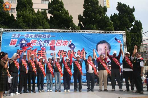隨著十二月三日三合一選舉選戰日期的逐漸接近,中國國民黨金門縣黨部於昨日上午10時舉辦一場「逗陣走 作伙拚」大會,為黨籍提名、徵召和報准的鄉、鎮長和縣議員候選人造勢,也為選戰加溫。 國民黨中央組織發展委員會副主委王能章也專程來金參與造勢活動,與金門縣黨部主委林國平共同為全體黨籍提名、徵召和報准的鄉、鎮長和縣議員披掛彩帶暨授戰旗。中國國民黨金門縣委員會經中央黨部核定:金門縣議員一個選區應選十八名,提名林長耕︿烈嶼鄉民代表會主席﹀、王再生︿縣議員﹀、洪成發︿縣議員﹀、許華玉︿縣議員﹀、莊良時︿縣議長﹀、許玉昭︿縣議員﹀、洪麗萍︿縣議員﹀等七位。另報准陳永財、許建中、楊永立、蔡群生、李麗貌、張雲德、周子傑等七位。鄉鎮長部份:金城鎮提名蔡輝詩︿現任金城鎮鎮長﹀,金湖鎮提名陳志強︿現任金湖鎮民眾服務社主任﹀,金沙鎮提名陳昆第︿現任金門縣青溪協會理事長﹀,金寧鄉提名李文俊︿現任金寧鄉鄉長﹀,烈嶼鄉徵召林金量︿現任烈嶼鄉鄉長﹀,烏坵鄉提名蔡元珍︿現任烏坵鄉鄉長﹀。 王能章籲請全體黨員共同支持黨籍提名、徵召和報准的鄉、鎮長和縣議員候選人,贏得勝選。他也批評執政的民進黨主政五年多,讓國家走向經濟敗壞、社會不安的狀況,這樣執政的民進黨,也就是讓民眾原來幸福美滿希望落空的主要原因,人民要贏回來的是經濟的突飛猛進、兩岸穩定的和平,沒有戰爭的威脅。 國民黨籍的鄉鎮長和縣議員候選人也帶著支持的選民到現場造勢,炒熱了選戰的氣氛。