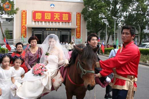 頭一遭騎乘鴛鴦馬的新人們,東「喬」西「喬」、又驚又喜,直摀著胸口暗叫「怕怕」。 鴛鴦馬,早期金門鄉親的交通工具、迎娶陣頭,新人驚喜,馬兒累透,好重ㄚ,因為身上駝著的,可是一生一世的約定。