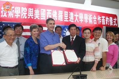國立金門技術學院再創學術新猷!繼與美國西佛羅里達大學簽訂合作協議與姊妹校關係後,金門技術學院校長李金振與來訪的姊妹校美國西佛羅里達州立大學校長約翰凱文諾博士(Dr.John Cavanaugh)代表兩校簽訂合作協定書,兩校將於明年度正式啟動雙聯學制,相互提供名額給成績績優學生分赴西佛羅里達大學及金門技術學院兩地公費的留學,又可以取得兩校的雙學位,建立中美合作、雙向學習的競爭優勢合作模式。 國立金門技術學院與姊妹校美國西佛羅里達州立大學,昨日共同簽訂合作協定書,簽約儀式於中午在金門技術學院舉行,由金門技術學院校長李金振博士和西佛大校長約翰凱文諾博士(Dr.John Cavanaugh)代表兩校簽約,在場觀禮的有凱文諾校長夫人克麗絲汀凱文諾(Christine Cavanaugh),以及金門技術學院師生代表。 李金振指出,所謂的雙聯學制模式就是二年金門技術學院加二年西佛羅里達大學修業方式;美國西佛羅里達大學將提供五個名額,供金門技術學院成績優秀同學於二年級課程修習完畢後,申請赴西佛羅里達大學攻讀三、四年級的課程,而獲選的同學只要繳交國立金門技術學院學雜費及報名費用,即可赴美攻讀剩餘兩年的課程,食宿全免,完成四年的大學學程後可取得兩校畢業證書。同樣的,國立金門技術學院在雙聯學制中也將提供十個名額予西佛羅里達大學學生申請,讓完成一、二年級的西佛羅里達大學的同學們能到金門地區就讀,學習中國文化、感受金門地區的閩南特色課程。 李金振高興的說,兩校藉此合作協議的簽署,更拉近了兩校實質的交流關係,也為國際學術交流再開新頁。他表示,兩校將於明年度啟動的雙聯學制,相互提供名額給學生就讀,學生可以享受公費的留學,又可以取得兩校的雙學位,讓就讀金門技術學院的學子有機會可以享受到美國大學提供的教育資源;相對的,未來在金門技術學院就讀的學生,除了有來自台灣和金門當地的學子,也將有來自東南亞的鄉僑子弟和大陸的青年學子,甚至有美國的青年朋友來金門學習中文,感受中國文化禮儀的薰陶,為校園注入一股新活力,也可透由美國學子與地區中小學生的交流,彼此相互學習不同的語言,將可帶動金門地區學習英語教育的密度,蔚為風氣。 李金振也表示,兩校建立姊妹校的實質關係後,不受空間的距離遙遠,緊緊拉近兩校間密切的關係,並跨出一大步,擴大遠距教學內容,建立雙向學習的合作模式,讓金門地區的學子們能與西佛羅里達大學同步授課,學習更多元化、國際化的課程,也帶動金門教育邁向國際化的新里程碑。 首度到金門訪問約翰凱文諾表示,這兩天的訪問行程,讓他們夫婦倆賓至如歸,金門許多的古蹟資產和戰役遺跡,都讓他們印象深刻,擁有美好時光。他也期待西佛大與金門技術學院繼續擴大交流合作內涵,建立長期伙伴關係。金門技術學院是在九十二年八月間與西佛羅里達州立大學(The University of West Florida, UWF)建立姊妹校關係,去年起,金門技術學院在應用外語系開設遠距教學課程,學生透過網路接受西佛大教授授課,並且一連兩個暑假安排學生前往美國遊學。 美國西佛羅里達大學簡稱UWF,主要校園位於佛羅里達州十英哩街市Pensacola,學校成立至今已有超過十萬名畢業生,該校並以藝術、科學、商學院及專業研究學院著名。