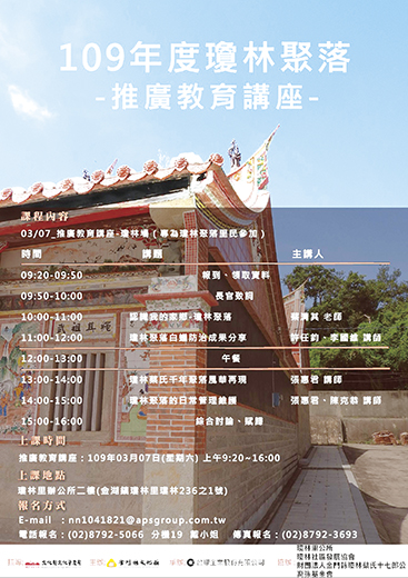 金門縣文化局將於3月7日上午九時至下午四時,假瓊林里辦公處二樓,舉辦本(109)年度最後一場推廣活動,講座課程以瓊林聚落居民為主,擬邀請瓊林社區發展協會或瓊林蔡氏十七郎公裔孫基金會等,共同協辦維護推廣講座,機會難得,對於瓊林聚落歷史脈絡有興趣的民眾歡迎踴躍報名! 為落實本縣「文化立縣」的目標,培育傳統建築保存人才,106至108年度文化局已舉辦多場傳統建築木構件危害與保存推廣活動,邀請學者及專業技術人員進行相關課程講授,獲得熱烈回響與好評。本次課程由專業講師解說瓊林聚落的形成、發展及重要性等,介紹聚落人事物的歷史介紹及日常管理維護,並分享瓊林聚落白蟻防治成果。 講座相關內容與最新資訊於臉書粉絲專頁「瓊林聚落581」公告,有任何相關問題,請洽詢電話02-8792-5066分機19,戴小姐。