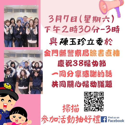 迎接「三八婦女節」到來,金門縣警察局為關懷本縣婦女並呼籲民眾一同重視婦幼人身安全,將於明(7)日(星期六)下午2點30分,在警察局臉書粉絲專頁(https://www.facebook.com/KinmenCountyPoliceBureau/)舉辦「三八婦女節—說出感謝的話」直播活動。 依據金門縣警察局臉書粉絲專頁上的說明,本次直播節目將邀請現任立法委員陳玉珍於該局官方臉書粉絲專頁與縣民朋友一同說出感謝的話,並藉由直播節目共同關心婦幼議題,提升婦女朋友自我保護意識,降低學童人身安全危機的發生,並慶祝婦女節的到來。 在此次直播活動,縣警局也準備10份防身警報器,只要縣民朋友於直播節目活動下標註2名朋友並留言:「三八婦女節快樂」,即可參與抽獎。 縣警局並希望藉由此次活動,宣導大眾共同營造婦女朋友尊重、安全與幸福的友善環境,並促使全民關心婦女安全議題!