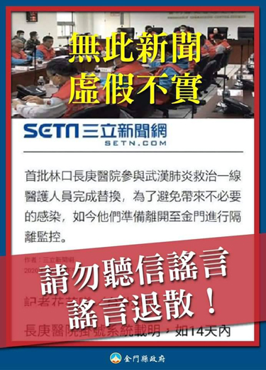 有關網傳三立新聞網報導「林口醫護人員將至金門進行隔離監控」一事,經金門縣政府與三立新聞確認,三立並無上述相關報導。金門衛生局也立即與疾病管制署連繫,強調未有該通報事件,並直指該報導是「假新聞」。 衛生局表示,該局已依程序報案,鄉親如有看到此網路假新聞,請勿恐慌,也勿轉傳。另外,對於本案蓄意散佈假消息者,該局也已截圖並搜集到相關資料,請警方併案處理。 衛生局也提醒大家,若在網路上看到未經查明的疫情資訊,切勿輕易相信、轉傳,以免觸法。依據紓困條例規定,散布假訊息,最重可關3年、併罰新台幣300萬! 另關於疫情相關資訊及措施,衛生局也說明,應以中央流行疫情指揮中心所公布的訊息為準。也請鄉親不要相信和轉傳來歷不明的訊息。