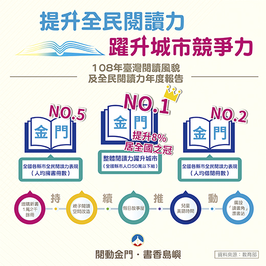教育部於109年3月1日公布《108年臺灣閱讀風貌及全民閱讀力年度報告》,整體閱讀力躍升城市,「縣市人口50萬以下組」由金門縣獲得第1名,另外整體閱讀力在「人口2.2萬至3.7萬組」成長幅度排名前5名部分,金寧鄉、金湖鎮分居1、3名。縣長楊鎮浯特別感謝鄉親讀者的愛書及文化局、鄉鎮公所的努力和推動。 金門縣政府推動「金門閱讀島」計畫不遺餘力,除編列足額預算,增購新書1萬2千餘冊,亦推動親子館閱讀空間改造及辦理假日故事屋、兒童美語時間等閱讀推廣活動,積極延伸服務觸角,帶動縣民整體閱讀力成長。報告中指出:「金門縣整體閱讀力成長8%,不僅在縣市分組中居冠,同時也是全國進步幅度最多的縣市,表現令人刮目相看」。 文化局表示,金門縣文化局整合公共圖書館讀者借書證、縣民卡及APP電子借閱證「三卡一體」及金門島圖書館「甲地借乙地還」實體書之服務功能,另外朝現代化RFID服務功能系統更新、自助借還書服務功能,讓現在借閱圖書更加方便,也有助於民眾多管道借閱。金門縣人口總數不過才14萬,圖書借閱人數還能每年成長,感謝民眾對文化局活動的喜愛與支持,如假日故事屋等周末例行活動,每每吸引眾多親子一同參加。雖然因為受到武漢肺炎(COVID-19)的影響,二、三月的假日故事屋暫停辦理,也歡迎民眾多多到各鄉鎮圖書館借閱圖書,充實知識與精神生活。 文化局指出,本縣在《108年臺灣閱讀風貌及全民閱讀力年度報告》中,平均每人擁書冊數有2.73本,名列全國縣市級第五;本縣金寧鄉及金湖鎮圖書館,每人借閱冊數名列鄉鎮市級前十,金寧鄉民平均借閱5.69冊,金湖鎮民平均借閱3.49冊。去年度借閱圖書以語文類最多,達31萬餘冊,自然科學、應用科學、社會科學類的圖書也有不少民眾借閱,各有4萬餘冊的借閱量,可見民眾閱讀興趣之廣泛。 報告中指出,在整體閱讀力「縣市人口50萬以下組」成長幅度排名前3名分別為金門縣、臺東縣及宜蘭縣。鄉鎮市「人口2.2萬至3.7萬組」成長幅度排名前5名分別為金門縣金寧鄉、屏東縣新園鄉、金門縣金湖鎮、嘉義縣大林鎮和苗栗縣通霄鎮;「人口1萬至2.1萬組」成長幅度排名前5名分別為苗栗縣大湖鄉、金門縣烈嶼鄉、苗栗縣頭屋鄉、雲林縣褒忠鄉和苗栗縣三義鄉。金門縣金寧鄉、金湖鎮和烈嶼鄉都表現出色。 金門縣文化局除了豐富館藏及辦理各項閱讀推廣活動外,亦積極設置「讀書角」漂書站,讓書香芬芳金門各角落,提升讀書風氣。文化局日後也將籌劃多種活動,鼓勵民眾閱讀,進而愛上閱讀,讓閱讀涵養生活。