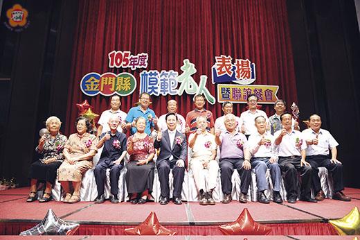 敬老尊賢慶重陽!金門縣政府昨日於昇恒昌金湖大飯店舉辦金門縣一○五年度模範老人表揚活動暨聯誼餐會,表彰地區的模範老人,縣長陳福海肯定得獎的模範老人在工作上的傑出表現、鄰里村落的好評,以及為家庭上的努力付出,並希望他們能帶動更多的老人家們投入公益活動,共同為下一代打造更好的環境,建構大同社會的理想。 這場表揚大會是在昇恒昌金湖大飯店舉行,由縣長陳福海主持,金城鎮長石兆瑉、金湖鎮長蔡西湖、金寧鄉長陳成勇、烈嶼鄉長洪成發、金城鎮代會主席陳天成、金湖鎮代會主席呂瑞泰及社會處長甯國平也親自出席與會,至於各模範老人得獎者的家庭成員也到場參與,一起分享得獎的榮耀。 陳福海在致詞時表示,金門的老人走過苦難的歲月,為後輩立下典範,這些老人們不但要養家活口、教育子女,有時更要投入村落與鄰里之間的事務,身兼工作與家庭教育、公益事業等不同的社會責任,他期望模範老人表揚,讓更多人看見這些老人們的付出,並由他們的表現來帶動後輩,一起投身公益與村落事務,讓社會環境更為和諧美好。 而在會中,陳福海也恭禧得獎者,並在會場內與得獎人員共同合照留念,現場氣氛熱絡動人,許多模範老人的家庭成員也藉此機會到場合影留念,為得獎留下影像記錄,共同見證這份榮譽事蹟。 根據社會處提供的資料,今年獲獎的模範老人包括了金城鎮林家鍠、陳榮泰、黃換、傅啟澤、盧士權、楊素治、許元德、許秀子;金湖鎮陳育雨、蔡心願、蔡乃貞、李陳寬資、陳嘉德、鄭明火、陳遠傑、黃奕添;金沙鎮黃欽良、陳永言、李榮協、許維男、蔡維夢、馬安輝、陳天賜、夏賢才;金寧鄉李炎城、莊西勢、楊清禮、薛德成、翁水千、蔡清淼;烈嶼鄉許乃甫、洪水嶺、吳金標、胡清江、洪天佑。