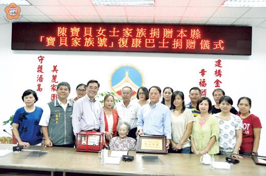 高齡八十八歲的陳寶貝女士,育有十名子女,子女們事業有成,手足間情誼深厚並以陳女士名字成立「寶貝家族」,家族們感念金門縣政府長期以復康巴士協助載送陳女士至醫院復健,減輕家庭照顧負擔,基於「取之社會,用之社會」的理念,並感念母親含莘茹苦養育之恩,於陳女士生日前夕,昨日以其家族的名義捐贈金門縣政府復康巴士一輛,做為陳女士的生日賀禮,並由副縣長吳成典代表受贈。 副縣長吳成典對於「寶貝家族」孝心與捐車義舉,代表縣長陳福海表達感謝之意與肯定同時,也呼籲鄉親多說好話、做好事,並以日行一善心懷,來讓社會更美好。 捐贈儀式昨日上午十一時起,在縣政府大禮堂會議室舉行,陳寶貝女士坐著輪椅,在子女和家族成員陪同下,將價值將近百萬元的復康巴士捐贈予金門縣政府,並由副縣長吳成典代表受贈。吳副縣長也致贈感謝狀予陳寶貝女士和寶貝家族代表黃海經,同時贈送每人一份紀念酒。在場觀禮的有縣府社會處長甯國平、副處長許美鳳、科長張至文等人。 寶貝家族代表黃海經表示,六十二年前,陳寶貝女士於未嫁入黃家時,陳女士家庭經濟環境極佳,陳女士父親是中式糕餅師父,生意很好,且僱有長工及丫環,陳女士如公主般倍受寵愛與服侍。陳女士嫁到黃家後,與丈夫育有十名子女(六男四女),陳女士脫去富家千金光環,與夫婿上山下海,不僅要協助田地耕作,種植地瓜、高粱等作物,還要到海邊挖石蚵、抓魚給孩子們補充營養,並貼補家用。 三十幾年的勞碌,使陳女士的雙腳膝蓋嚴重退化,致在她六十歲時換置人工膝關節。而在二年前,陳女士行動力變差,黃海經陪同陳女士就醫,醫師診斷陳女士人工膝關節受損,需開刀治療,惟考量陳女士年歲已高,兄弟們聽從醫師建議,不施予開刀治療,改由復健治療方式,以防止其膝蓋萎縮。 家族們向縣府申請復康巴士,定期載送陳女士至醫院復健。期間,家族們有感「取之社會,用之社會」,並感謝縣府協助幫忙,又受到黃海經同學楊碧峰於今年五月以其父母親名義捐贈本縣復康巴士「吉寧 梨珍號」的善心義舉感召,家族決定以其家族的名義捐贈本縣「寶貝家族號」復康巴士一輛,亦作為陳女士生日賀禮。 縣府社會處長甯國平表示,本縣身心障礙人口數計有5,770人,65歲以上老人人口(15,411人)比例佔本縣人口(133,656人)比例11.5%,本縣身心障礙及行動不便老人,每年使用復康巴士高達40,000餘人次,這部嶄新的復康巴士將巡迴全島提供身心障礙者及失能老人就醫及復健交通接送,藉由寶貝家族的孝心及善行與陳寶貝女士的愛心,散播在金門每個角落,讓長輩們感受人間處處有溫暖,也希望藉由寶貝家族的拋磚引玉,有更多賢能者投入公益活動,創造更祥和樂利溫馨社會。