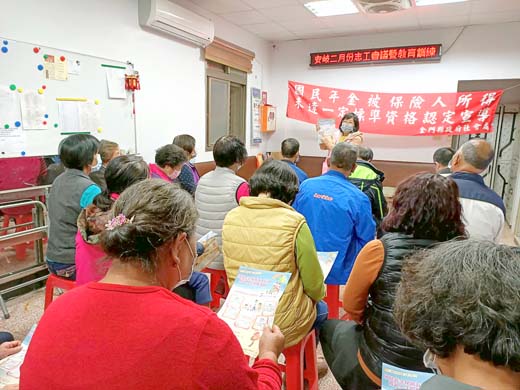 為增進社區志工隊之聯繫與互動,金寧鄉安岐社區關懷據點志工隊日昨召開109年2月份志工會議暨國民年金宣導活動,研討關懷據點、共餐服務志工排班與通報服務等,公所社會課志工承辦督導楊玉佩指出,楊鄉長非常注重社區業務的推動,也感謝志工伙伴為社區犧牲奉獻的付出,期許透過聯繫會報的召開傳遞志願服務重要施政方針,期能相互溝通及分享經驗、凝聚志工向心力及發揮團隊精神。 安岐社區關懷據點志工會議暨國民年金宣導活動,由志工隊長陳蓮與社區理事長吳神佑共同主持,常務監事薛成吉及志工業務承辦督導楊玉佩列席,計有志工三十多人齊聚一堂分享服務經驗,同時討論各項活動工作事宜,包括討論志工訪視個案調整編組,以及各節慶辦理相關事宜討論等。社會課志工業務承辦人楊玉佩代表鄉公所列席參與會議,為志工團隊打氣,也聽取志工們提出的地方上建議、以及從事服務過程中面臨的問題,來提供幫忙。 社區志工隊長陳蓮表示社區每月二次試辦性共餐,感謝志工都能負責來完成任務,針對克難廚房場地擁擠狹小,提醒志工要注意自身安全,以防發生意外事故。同時肯定鼓勵為熱愛的家鄉和居住的社區奉獻一份心力,共同建設充滿熱情及溫暖氣息,期望藉此次志工聯繫會議,一起分享、討論及交換意見,以利提升志工管理上的效益。 理事長吳神佑感謝社區志工媽媽投入,為弱勢鄉親無悔的付出。並指出,成立關懷據點老人共餐服務,應考慮到籌備相關工作事項,如轄區共餐年齡層人數統計、廚房廚具等環境設備、廚工人力配置考量、共餐經費來源、不定期辦理次數等等,目前會先籌備規劃好後,希望能先辦好不定期共餐服務,鼓勵社區長者多走出戶外,大家一起相聚聊天及參與活動。更期許未來也會結合社區據點人力加強落實這區塊,做好弱勢族群以及關懷獨居長者的服務工作,讓長者可以享受到政府照顧的資源。 會中宣導告知參加國民年金對自身有何益處及如何維護自身權益。並解說國民年金保險(以下簡稱國保)自97年10月1日開辦,讓年滿25歲至未滿65歲且未參加軍保、公教保、勞保、農保等相關社會保險的國民都能獲得社會保險保障。所以宣導中將國保的好處及重要權益事項更為推廣至每個角落,讓更多民眾對國民年金制度有更正確且深入的認識,並了解按時繳納保費,以維護領取給付權益的重要性。