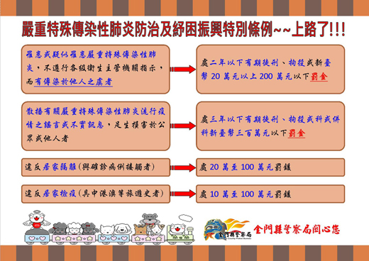 「嚴重特殊傳染性肺炎防治及紓困振興特別條例」業經總統公布(見圖),金門縣警察局刑事警察大隊為加深民眾熟知相關規定,特別在金門縣警察局臉書以及金門縣警局刑事警察大隊臉書專頁辦理「按讚、留言、分享」抽獎活動,獲得民眾熱烈迴響,昨日總計抽出二十位幸運中獎者,得獎名單並公布於臉書專頁,可獲得警察Q版隨身碟16G一個,各得獎者應於本(3)月15日前備妥身分證件於每日上午9時至下午6時至該局刑事警察大隊(金門縣金寧鄉頂林路317號,「金寧中小學正對面」)領取。 縣警局分別在金門縣警察局(https://www.facebook.com/KinmenCountyPoliceBureau/)臉書及金門縣警察局刑事警察大隊(https://www.facebook.com/KPB.CID/)於2月27日起辦理這項「嚴重特殊傳染性肺炎防治及紓困振興特別條例」法令宣導抽獎活動。 參加者只要1.於該紛絲專頁及該貼文按「讚」。2.於留言處標記2名好友並留言「不實訊息不亂傳 居家隔離不亂跑」。3.「公開」分享此貼文於個人FACEBOOK專頁。並於2月27日起至本(3)月1日前完成以上步驟者,二處臉書專頁約有近五百位民眾參與,警局刑大於昨(2)日各抽出10名幸運得獎者,獲得「警察Q版隨身碟16G」1個,得獎名單並公布於臉書專頁。縣警局刑大提醒得獎者應於3月15日前備妥身分證件至該局刑事警察大隊領取,逾時將取消中獎資格,該局將不再另行通知。 縣警局刑大表示,「嚴重特殊傳染性肺炎防治及紓困振興特別條例」全文19條;施行期間自一○九年一月十五日起至一○○年六月三十日止,但第12~16條自公布日施行;施行期間屆滿,得經立法院同意延長之。 刑大也特別針對當中第12條至第14條之規定提醒民眾注意。 第12條:對於經中央衛生主管機關公告之防疫器具、設備、藥品、醫療器材或其他防疫物資,哄抬價格或無正當理由囤積而不應市銷售者,處五年以下有期徒刑,得併科新臺幣五百萬元以下罰金。 前項之未遂犯罰之。 第13條:罹患或疑似罹患嚴重特殊傳染性肺炎,不遵行各級衛生主管機關指示,而有傳染於他人之虞者,處二年以下有期徒刑、拘役或新臺幣二十萬元以上二百萬元以下罰金。 第14條:散播有關嚴重特殊傳染性肺炎流行疫情之謠言或不實訊息,足生損害於公眾或他人者,處三年以下有期徒刑、拘役或科或併科新臺幣三百萬元以下罰金。