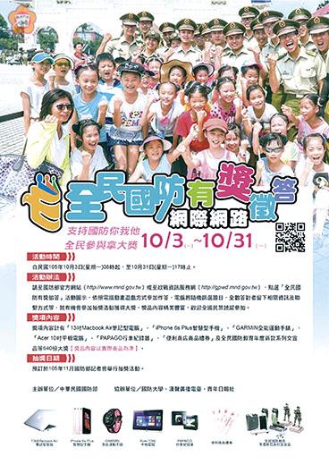 一項由國防部主辦的105年「全民國防網際網路有獎徵答活動」,即將於十月三日上午八時至十月三十一日下午五時止舉辦,獎項有「Mac筆記型電腦」等十五項六百四十名。金門縣政府民政處宣導鼓勵縣府所屬機關員工、學校師生,以及本縣民眾踴躍上網參加。 縣府民政處表示,今年的「全民國防網際網路有獎徵答」活動,請至國防部官方網站(http://mnd.gov.tw)或至政戰資訊服務網(http://gpwd.mnd.gov.tw),點選「全民國防有獎徵答」活動圖示參加作答,全數答對者留下相關資訊及聯繫方式等就有機會參加抽獎活動獲得大獎。 民政處指出,這項活動實施構想,旨在透過網際網路策辦有獎徵答活動,積極推廣宣導,藉以推動「全民國防教育」理念,使全民瞭解國防重要性,以增進全民國防知識及防衛意識,確保國家安全,達全民國防教育目標。 民政處表示,參加活動者應提供真實姓名、身分證字號、地址、電話及年齡層等資料,以作為主辦單位辦理抽獎、聯繫、寄發得獎人獎品及申報所得扣繳憑單之用;且無偽、冒用他人個人資料情事。參與該活動之個人資料,如涉及個人資料保護等事項者,由國防部依相關法令規定辦理。 全民國防網際網路有獎徵答活動獎項包括有:(一)、頭獎:一名,得「13吋Macbook Air筆記型電腦」一台。(二)、貳獎:三名,各得「Iphone 6s Plus智慧型手機」一台。(三)、參獎:四名,各得「GARMIN 全能運動手錶」一支。(四)、肆獎:五名,各得「宏碁10吋平板電腦」一台。(五)、伍獎:七名,各得「PAPAGO行車紀錄器」一台。(六)、陸獎:三十名,各得「便利商店商品禮券二千元」。(七)、柒獎:一百名,各得「便利商店商品禮券一千元。(八)、捌獎:三百五十名,各得「便利商店商品禮券五百元」。(九)、玖獎:一百四十名,特戰公仔二十名、雲豹甲車萬年曆二十名、沱江級艦手機座二十名、經國號Q版戰機二十名、油箱造型存錢筒二十名、手榴彈造型運動水壺二十名、數位迷彩筆記本二十名,共計一百四十名。 民政處表示,抽獎日期訂於今年十一月份於國防部記者會舉行抽獎活動,由玖獎至頭獎依序抽出,採電腦隨機抽取方式,(每位參加者以得獎一次為限),並廣邀媒體現場報導,以昭公信。其得獎名單,電腦抽獎現場立即公布,並於抽獎結束後在此項活動相關單位網站公布得獎名單。 此外,縣府民政處表示,國防部為推動全民國防教育,增進全民國防知識及全民防衛國土意識,藉辦理「網際網路有獎徵答」活動,提高國人參與意願,強化全民國防教育成效,達全面普及、深化教育目標。