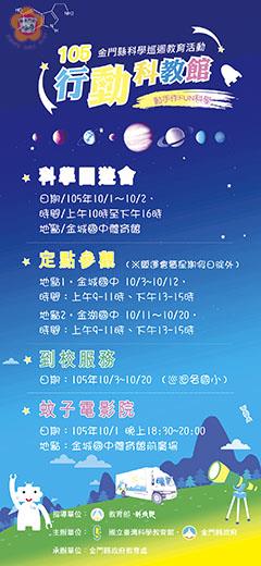 由國立臺灣科學教育館、金門縣政府主辦,金門縣政府教育處承辦的「105年行動科教館金門縣科學巡迴教育」,今起將在金門展開活動,除了今日下午13時至17時展開一場教育訓練,配合系列活動,10月1日至2日亦將在金城國中辦理「科學園遊會」,歡迎全民踴躍參加。 縣府教育處指出,這是國立臺灣科學教育館行動科教車首度渡海來金,藉由國立臺灣科學教育館在園遊會提供的科教巡迴車及科教器材,希望能普及科學教育、平衡城鄉落差,同時讓地方學子、鄉親都可親炙現代科技的進步。 教育處表示,105年行動科教館~金門縣科學巡迴教育系列活動項目包括: ◆科學園遊會(動手作FUN科學&闖關&摸彩)│日期/105年10/1~10/2(時間:上午9:00~下午17:00),地點/金城國中體育館。 活動內容:1、旗艦區:戶外科教巡迴車│3D低碳行動電影院、看見未來時光號、行動圖書車展示、科學教育講座。2、體驗區:室內設置35個創意科學攤位,包含益智器材及科學體驗、實作攤位。3、資源區:室內設置有科學DIY活動。 ◆蚊子電影院日期/時間/地點:105年10月1日晚上6:30~8:00金城國中體育館前廣場。 ◆科教巡迴車定點參觀│日期:105年10/3~10/20(縣運會暨星期假日除外),地點/時間:1、金城國中10/3、10/4、10/5、10/6、10/7、10/11、10/12(每天二時段:上午9-11時、下午13-15時)。2、金湖國中10/17、10/18、10/19、10/20(每天二時段:上午9-11時、下午13-15時)。 活動內容:1、影片觀賞:3D低碳行動電影院。2、科學展示:看見未來時光號。3、科學體驗:設置8項體驗實作創意科學攤位。4、核能講座:核能講座另教育處指出,參觀人員請依主辦單位安排學校學生參加,不另對外開放。 ◆巡迴車到校服務10/3~10/20(縣運會暨星期假日除外)1、科學演示:科教館展場之教學演示擇項辦理。2、科學展品展示:基礎科學展品。3、益智科學器材闖關:6件闖關益智器材及6項積木拼圖或解環活動。