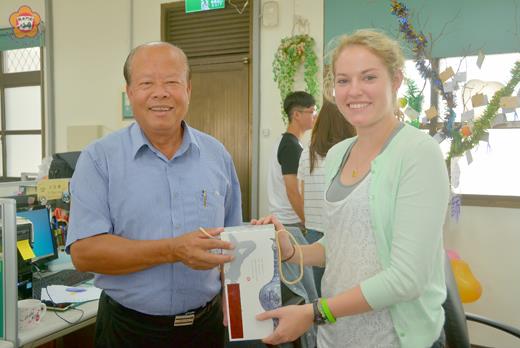 許加泰/圖文 金門高粱酒甘冽香醇,享譽國際。上岐國小外籍教師雷凱莉(Kelly Rae)很開心收到烈嶼鄉長洪成發贈送的教師節禮物。雷凱莉說,這一瓶好酒會帶回美國分享家人。 鄉長洪成發感謝離島教師為離島教育所付出的辛勞,特別訂製一款瓶身很漂亮的高粱酒,做為今年的教師節賀禮。日前,洪成發親自到轄區學校向教師賀節,也包括各校的外籍教師。 來自美國的雷凱莉(Kelly Rae)來金門一年,第一次收到教師節的禮物,很驚喜金門還有這一項好的福利。雷凱莉開心拿著主題酒和洪鄉長合影,並透由無遠弗屆的資訊網路和美國遠方的家人一起分享教師節的喜悅。