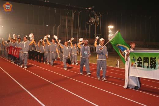 九十四年全國運動會昨日下午六時在雲林縣斗南田徑場揭開序幕,被安排在最先進場的金門縣代表隊,由金門縣體育會理事長王異生率領選手及隊職員在縣旗引領下進場,受到全場觀眾的熱烈歡迎。包含教練、選手在內,本屆全運會金門代表隊計有二十九位選手,將參與田徑、跆拳道、自由車、健美、保齡球、帆船等六項競技,預定廿日閉幕。 由於另有要公,縣長李炷烽不克出席,但他還是特別致電代表隊為大家加油打氣,領隊一職改由王異生出任。地主雲林縣為了禮遇離島縣市,仍按照慣例安排金門、連江兩縣代表隊員優先進場,地區選手們進場時,全場觀眾報以熱烈掌聲。 王異生表示,這是他就任理事長以來首次領軍,感到相當光榮,而他也期許代表隊選手們可以有好的表現,為金門爭光;金門縣代表隊總管理李再杭也說,此次金門代表隊進場時特別手持「金門縣代表隊|高粱酒的故鄉」布條,相當受到矚目,也成功為金酒公司打響廣告。 全運會開幕典禮於昨日下午五時二十分起展開,由行政院體育委員會主委陳全壽主持,包括總統陳水扁、行政院長謝長廷等貴賓也出席參與,另外表演活動眾星雲集,有動力火車、KONE、阿桑等歌手助陣,全運會代言人王力宏也賣力開唱。此外,典禮也依「傳承、創新、躍動」精神,由雲林縣七所學校八百位學生,以及十一個表演團體共同演出的「歡喜鬥陣迎全運」、「魔豆森巴嘉年華」和「希望起飛的所在」,場面相當熱鬧。 值得一提的是,全運會在開幕典禮上以「亞奧運」點燃聖火模式規劃了全國首度呈現的環場煙火設計,以9發飛箭煙火分成三道自聖火台飛向司令台後,引燃四波480發瞬間火龍煙火,以每0.01秒間隔速度燃放,接著二側看台以風火輪煙火特效掀起一波波高潮,在風火輪煙火的引導下,啟動「LED科技烽火輪」,並引燃勝利之火,緊接著在震撼的虎尾煙火、長達80米的瀑布煙火及高空煙火的交織,壯闊的煙火秀讓人印象深刻。 今年的全國運動會共有二十五個縣市,近九千一百多位選手參與,角逐三十四種競賽項目,爭奪三百五十四面的金牌,而各項賽程將從今日起陸續登場,而開幕前已有划船、自由車、保齡球等項目提前開戰。 金門地區參與本屆全運會的男女選手計有二十九人,選手實力都相當堅強,可望再為地區拿下多面獎牌,其中較被看好的項目有:跆拳道、田徑、自由車與健美,跆拳道部分,若蘇麗文如願得下金牌,可望獲得四連霸。 田徑方面,參賽的選手清一色都是男性,僅有二位女選手,由教練辛雷達與黃嘉維率領,選手包括何盡平(五千、一萬公尺、三千公尺障礙)、何盡文(五千、一萬公尺)、李智章(八百公尺)、黃世昌(八百公尺)、李易勳(馬拉松)、翁瑀涔(馬拉松)、楊易霖(一千五百公尺)、蔣光明(三千公尺障礙)、楊耀光(一千五百公尺)、莊毓虹(五千公尺)、李嘉慧(五千公尺)。 另一個具有金牌實力的隊伍則是健美項目,本年度由林登惠領隊,陳建發擔任教練,選手包括男子組健美第七級汪再莒、第五級李政傑二人,兩人近來在健美選拔賽中都有不錯成績。 自由車項目亦有「二○○二年亞洲盃登山車錦標賽」金牌選手陳如妙,將代表金門參與女子個人公路賽。 保齡球方面,雖然歷屆的比賽成績不盡理想,但地區球友並不氣餒,依舊屢敗屢戰,組隊參與這項盛會。本年度的保齡球代表隊由周浯斌領隊,蔡啟仁擔任教練,楊龍隆擔任隊長,隊員包括李馬成、張惠民、簡永昌、陳志銘、許聰明與女子選手洪巧菱等。 昨日參與開幕式的金門代表隊隊職員除領隊的王異生之外,還包括總幹事盧志輝、副總幹事許換生、總管理李再杭、總教練陳國生等。今(十六)日排定的賽程包括田徑男子一萬公尺決賽,及一千五百公尺預賽,跆拳道等項目也將展開預賽。這項運動會係從「省運會」、「區運會」一路發展而來,自八十八年起改為「全國運動會」,並採「縣市申辦制」,今年由雲林縣政府取得主辦權。