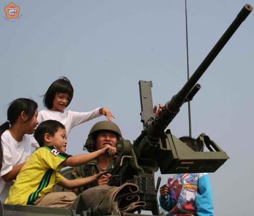 支持軍購,開放陣營;全民國防,長大當兵!金門防衛司令部昨天開放昔果山中心教練場,讓二千名軍民觀賞金西旅裝步連的戰力展示。小朋友登上裝甲步兵戰鬥車,手觸機槍,興高采烈,情緒激昂,忍不住大喊:我長大要當兵! 這次的開放營區活動,邀請了數百名民眾前往觀賞。部隊不但個個身穿紅色印記的白色汗衫,上面標示「支持軍購」四個大字,還把「支持軍購」的超級大字,標籤於學生表演團體的醒獅鼓上,讓小朋友也成為「支持軍購」的鼓吹者。金防部司令吳達澎則在會場中一再強調全民國防的觀念。 為了祝賀十月國慶,金門防衛司令部昨天舉辦「金防部慶祝國家慶典開放營區暨懇親會」。節目包括兩棲營蛙人操、裝部連戰鬥操演及各單位裝備展示。 兩棲戰技蛙人操的表演項目包括全跳、邊彎、掌上壓、背部運動、仰臥打水、手腳坐起、仰臥挺身、跪臥挺腹、腹部運動和強背。這些操練,在平日都是為了訓練蛙人刻苦、耐勞、勇猛、頑強的戰鬥精神;表現在體格上,則是類似銅骨鐵肋、虎背熊腰的感覺。 金西旅步二營裝步連操演的項目包括戰場閱兵和連攻擊。戰場閱兵的目的是顯揚軍威、激勵軍心。接受校閱的裝步連區分為連部組、裝步一、二、三排、八一砲排等五個排組。全連配賦國造CM21A1裝步戰鬥車十三輛、CM23八一砲迫車三輛;平時為金西戰備應變部隊,依令支援責任區內反機降、反特攻、反突擊等任務。戰場閱兵是由吳達澎主持校閱,民眾及學生代表也獲邀在車隊中參觀軍容。 校閱完畢後,由參演部隊的營長對連長下達攻擊命令;各排排長則到連長處授命。當部隊完成機動準備後,便開始進行連攻擊的操演課目。十三部CM21A1出發進行攻擊,車上配備兩射口,一挺五○重型機槍;三部CM23八一迫砲車在土堤後方佔領陣地,實施火砲放列,提供火力支援。 攻擊目標為一群頭戴紅色偽裝帽的機降敵人(假想敵),他們企圖實施破壞。當車輛到達目標前沿,裝甲步兵便由裝步戰鬥車後方的著陸板湧出,與敵人展開戰鬥。這次的表演,在軍隊佔領敵陣後,當風颺起的旗幟不只是青天白日滿地紅的國旗,還多了一面「支持軍購」的白字紅旗。 戰備展示的內容包括:M49A2C油罐車、美造M115式八吋榴彈砲、M60A3戰車、M41D戰車、M101A1式105榴彈砲、國造T75式120公厘迫擊砲、國造T75式81公厘迫擊砲、0.50吋機槍、M249式班用機槍、MK19式40公厘榴彈機槍、T85式榴彈槍、65K2步槍、T74排用機槍、悍馬輪型戰術車。 在開放營區的現場上,「支持軍購」的標語處處,明白告知民眾軍人推動政策的立場。對於這樣的訴求,參觀民眾反應不一。在場受訪的七名民眾,有三人贊同、三人反對,一人說不知道,顯示民意還是多元不一的。 立法委員吳成典表示,為了和平,他支持軍購;為了台獨,他反對軍購。不過,軍購是為了和平或台獨,他到目前還找不到答案! 無論如何,這次的開放營區活動還是辦得熱鬧非凡。參加者包括金防部一千二百位兵士官將以及大約八百名左右的民眾。福建省主席顏忠誠、金門縣長李炷烽、立委吳成典、金沙鎮長黃奕焮都是座上賓。應邀參加表演的學校社團和節目有開瑄國小的二十四節令鼓、中正國小的鼓吹、金門中學的管樂。金門榮服處處長薛幼菊、金門縣動員管理組組長林恆毅則率所屬人員重回軍營。 金防部指出:這次活動,是為了讓民眾見證國軍近年來建軍的成果與部隊訓練的成效,支持國軍,建立全民國防的共識。 金防部強調:全民國防是現代國家求生存的法寶,也是世界的潮流。貫徹︽全民國防教育法︾國家才能永續發展,社會才能長治久安。