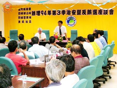 由金門地檢署等單位聯合舉辦的94年社區治安暨三合一選舉|查察賄選防治會議,昨日移師烈嶼舉行,金門地檢署檢察長劉家芳、警察局局長陳瑞通說明檢、警、調單位積極查辦年底三合一選舉賄選的行動,也呼籲全民一起來檢舉買票賄選者,免費檢舉電話:○八○○|○二四|○九九,電子郵件檢舉信箱:tp14@mail.moj.gov.tw,檢察官檢舉熱線電話:○九一二|二八七|七四五、○九一二|二八七|四九二。 劉家芳也表示,民眾具名檢舉而查獲賄選案件,檢舉人更可獲得高額獎金;其中,縣長候選人為新台幣五百萬元;縣議員候選人為兩百萬元;縣長、縣議員候選人的配偶、直系血親、五親等旁系血親、三親等內姻親及依法設置競選辦事處負責人為一百萬元;鄉鎮長候選人或樁腳等人五十萬元。凡檢舉賄選案件一定做到「放心來檢舉,放心領獎金」的保密安全原則,請大家放心勇於檢舉。 由金門地檢署、烈嶼鄉公所、烈嶼警察所、東坑社區發展協會聯合舉辦的社區治安暨三合一選舉|查察賄選防治會議,昨日下午二時假烈嶼鄉公所2樓會議室舉行,地檢署檢察長劉家芳、警察局局長陳瑞通親自到場宣導,烈嶼地區各機關、各社團、各社區發展協會參與踴躍。劉家芳說,為防堵買票賄選,由檢、警、調專人蒐集鎖定「賄選黑名單」候選人的動員、人脈、金脈等情資,深入知悉該候選人之賄選態樣、樁腳系統,掌握候選人與樁腳間之賄選規劃,進而掌握個案偵查情資。而查察賄選的重點擺在「清查幽靈人口」和「嚴查買票賄選」,希望重新塑造金門乾淨選風。民眾若有幽靈人口或買票賄選等相關資訊要提出檢舉,除了可以就近向信任的調查員或警察提出檢舉外,也歡迎直接向金門地檢署來提出檢舉,免費檢舉電話:○八○○|○二四|○九九。