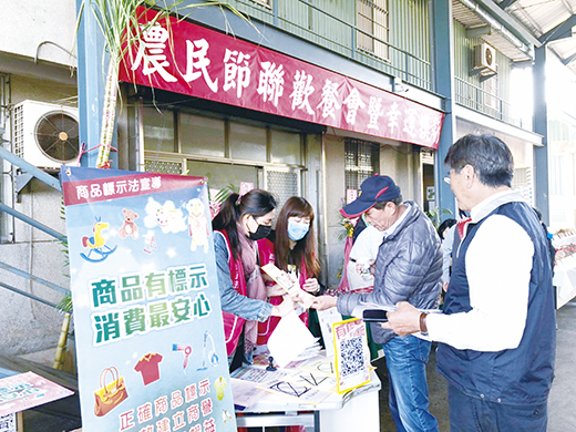 金門縣政府建設處於昨日上午,在金門縣農會穀物乾燥中心,配合金門地區慶祝109年度農民節表彰大會辦理商品標示宣導,現場發送貼有商品標示宣導標語及相關法令連結QR Code之特選標示合格宣導品,在感謝農民朋友對社會貢獻的同時,亦期能激起社會大眾對於友善消費環境的重視,學習選購有完整標示之商品,保障自身消費權益。 縣府建設處商品標示宣導,特別結合慶祝109年度農民節表彰大會活動,以提起農民朋友及鄉親們對於商品標示的重視,選購有合格標示之日常生活用品,保障自身用的安全,並促進商品正確標示,維護企業經營者信譽,近期因武漢肺炎影響,本縣諸多活動均已停辦,唯本次農民節表彰大會活動行之有年,為免農民朋友期待落空繼續辦理,縣長楊鎮浯與各界貴賓均特別到場祝賀,現場並有農業成果展,展示農民們辛勤耕作的各式蔬果作物以及農產加工產品。 在此次活動中建設處以寓教於樂的方式,教導農民朋友相關商品標示認知,向參與活動民眾宣導商品有標示,消費最安心,標示不全商品不買,才能確保買的安心,用的放心。 建設處說明,商品標示法為經濟部所訂定,並針對各類商品,訂定服飾、文具、玩具、鞋類……等11類基準,商品於流通進入市場時,應依法標示,杜絕不良製造商及企業經營者,在此提醒業者正視並遵守,保障消費者知的權利,並藉此提醒各界公、私部門,採購開發宣導(禮、紀念、文創)品致贈民間,應要求業者依商品標示法及相關標示基準規定標示,避免提供無完整商品標示之宣導品(文創品),以維護社會大眾用的安全。 此次商品標示宣導活動除了教導農民朋友商品標示及其基準,並特別發放特製宣導單張,說明服飾、織品標示基準應標示事項,以及認識洗標圖案,其中服飾標示基準第三條規定,應行之標示事項:一、國內產製者,應標示製造廠商名稱、電話及地址;其為進口者應標示進口廠商名稱、電話及地址。二、尺寸或尺碼。三、生產國別(製品主要製程地之生產國別)。四、纖維或羽絨成分。五、洗盪處理方法。 消費者及各界對於了解商品標示有需求者,皆可至經濟部「全國商工行政服務入口網\商工行政法規檢索系統」查詢商品標示法及相關基準,以瞭解更多詳細商品標示相關規定資訊,網址為:http://gcis.nat.gov.tw/elaw/lawDtlAction.do?method=browse。(全國商工行政服務入口網/法令解釋/商工行政法規一覽表/商業法規/商品標示法及相關法規命令),或掃描QR Code連結。