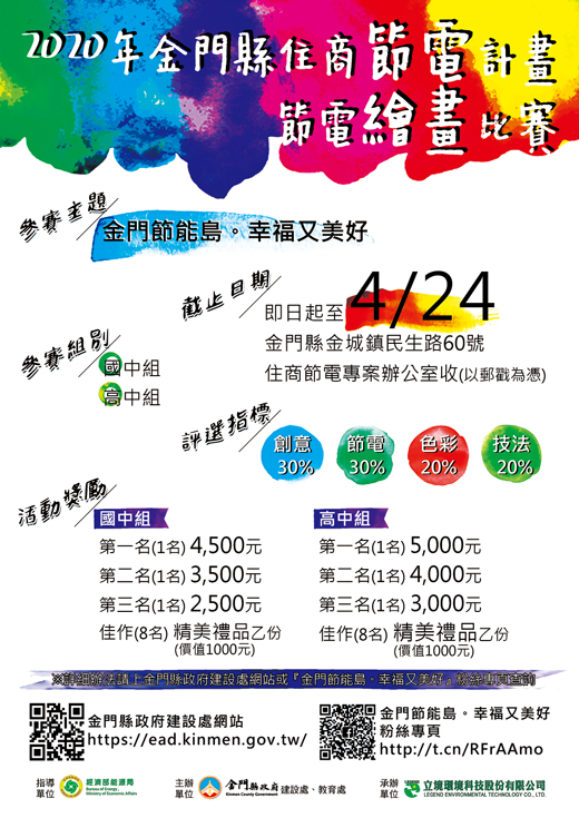 金門縣政府積極推動「縣市共推住商節電行動計畫」,今年將持續舉辦金門縣節電繪畫比賽活動,希望將節電意識擴及至各鄉鎮,並形塑全面性之節電環境與氛圍。 縣府指出,由建設處主辦的節電小尖兵—繪畫比賽,去年參賽作品達242件,廣獲本縣轄內國、高中學生迴響,參賽學生也發揮自身創意與想像,繪出具有關節電主題的作品,獲各界好評。 縣府表示,金門縣節電繪畫比賽係以「金門節能島‧幸福又美好」為繪畫主題,期以繪畫比賽加強國、高中學生們節電觀念,從小養成節約能源的習慣,並傳遞給青年學子珍惜環境、愛護金門的觀念。此次金門縣節電繪畫比賽將金門縣轄內國、高中學生分成兩組參賽,評選指標包含:創意展現、節電主題、造型色彩及表現技法等,徵件期間從活動訊息公布日起至四月二十四日止,每人限繳一件作品參賽。 金門縣節電繪畫比賽作品規格以八開圖畫紙(39.5cm × 27.5cm)為限,圖畫紙可至各學校或金門縣政府「住商節電專案辦公室」(縣政府服務台右側第一間)索取,圖畫紙背後皆印有報名表格,請參賽者務必填寫。作畫方式採素描、粉彩筆、水彩、油畫、蠟筆、彩色筆等平面作品,不接受團體共同創作或立體作品,參賽作品請送至金門縣政府住商節電專案辦公室、由學校代為收件或郵寄至金門縣政府住商節電專案辦公室(89345金門縣金城鎮民生路60號),郵寄封面請載明「節電繪畫比賽」,收件日期以現場收件日期或郵戳日期為準,逾期不予受理。 金門縣節電繪畫比賽各組獎勵如下: 國中組:第一名(1名):獎金4,500元及頒發獎狀一面。 第二名(1名):獎金3,500元及頒發獎狀一面。 第三名(1名):獎金2,500元及頒發獎狀一面。 佳作(8名):精美禮品乙份(價值1,000元)及頒發獎狀一面。 高中組:第一名(1名):獎金5,000元及頒發獎狀一面。 第二名(1名):獎金4,000元及頒發獎狀一面。 第三名(1名):獎金3,000元及頒發獎狀一面。 佳作(8名):精美禮品乙份(價值1,000元)及頒發獎狀一面。 如有任何疑問可於上班時間(8:00-12:00,13:30-17:30)撥打專線:321635,將有專人為您說明服務。