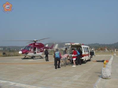 烈嶼消防分隊昨日假烈嶼東崗直昇機停機場舉行一場緊急事故傷病患後送急救及模擬直昇機機械故障迫降,應變處置等綜合演練,讓消防人員熟稔緊急事故傷病患作業程序及航空器發生火警處置應變能力。 烈嶼消防分隊是於昨日下午十五時組成直昇機緊急事故傷病患及航空器火警應變處置綜合演練作戰編組,由分隊長董必文擔任現場指揮官,小隊長李永明擔任副指揮官,組員董紀瑋,許志強,歐聲瑋、林冠宇、曾英誌、及烈嶼義消等廿二員在烈嶼東崗直昇機停機場進行演練。 該項演練,首先模擬重大傷患,因發生車禍,傷勢嚴重,需立即後送台灣醫治,及航空器火警的災害狀況,演練前並先於現場實施兵棋推演及任務分配,共同研擬災害搶救處理模式,以建立處理機制。緊接著進行演練任務分配,實際模擬狀況,假設直昇機因天候不良於下降執行後送任務之時,發生機械故障,尾部起火燃燒,迫使直昇機迫降東崗直昇機場,烈嶼分隊接獲勤指中心轉報后,立即出動救災車組,抵達現場隨即兵分兩路,一組立即佈水線撲滅火勢,另一組利用各項破壞器材,展開人命救助,由於直昇機尚在啟動狀態,加上起火燃燒,造成搶救上之困難,經過消防人員全力迅速搶救之下,火勢在很短時間內即被撲滅,受困人員隨即被消防人員救出,送往烈嶼分院。整個演練內容實況逼真,建立有效災害處理模式。 董必文表示,烈嶼分院目前因尚未配置救護車,因此有關烈嶼地區之轉診、後送、及安寧返鄉等工作,皆由該分隊協助執行,平時除了執行救災、救護及為民服務等工作,尚得協助後送工作,在人力有限之狀況下,為防範發生重大事故,同時執行各種狀況處置,以便能順遂消防工作,平時即模擬轄區各項可能發生之災害狀況,並藉由實際模擬演練,以達到提昇搶救及緊急救護勤務執行效能,維護公共安全及確保民眾生命財產。