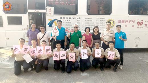 雖然颱風重創金門,全島總動員進行災後復原工作,但是仍有許多民眾不忘挽起袖子,捐出熱血、救人一命。地區一群教育服務役的替代役男們,趁著此次第二波捐血活動的最後一天,前往金門大學捐出熱血。 台北捐血中心今年第二次的「快樂捐血、愛在金門」活動,從本(九)月十三日起,分別巡迴了金門縣警察局、金沙鎮公所、金寧鄉公所、金城鎮公所、金湖鎮公所等地區,最終站開抵金門大學。 在金門各學校服務的教育替代役男一行共計十五人,在金門縣校外會督導張智芳、縣府教育處體健科長王麗娟、教官楊國良等人的率領下,前往設在金門大學的捐血車來貢獻愛心。巧的是,縣議員陳滄江恰巧也前往響應捐血。 張智芳表示,捐血是相當利人利己的事情,不僅對於自身新陳代謝有所助益,捐輸出來的血液,也能用於救人的用途,是相當有正面意義的。同時,也正好發揮了替代役「愛心」的理念與宗旨。