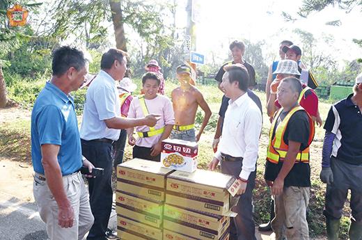 莫蘭蒂颱風重創金門,救災人員揮汗賣力投入各項災害復原與環境清理工作,金門紅十字會捐贈二百箱運動飲料給五鄉鎮公所的救災人員,慰問大家的辛勞,感謝他們付出與奉獻。 會長王水彰率同該會常務監事許秋霖、常務理事林再求、監事彭垂濱、周永春、理事邱嘉樹、總幹事長陳忠飛、副總幹事何鴻樟、周清庭等人前往金城鎮公所捐贈運動飲料,受到金城鎮長石兆瑉的歡迎。 王水彰指出,金門紅十字會這是第三波捐贈飲料為救災人員加油打氣,其中,第一次捐贈二百箱舒跑運動飲料給縣府救災中心,中心指定送至林務所;第二次是轉贈維他露公司捐贈的三百箱舒跑運動飲料給縣府救災中心。 王水彰說,這次捐贈給五鄉鎮的二百箱舒跑運動飲料,是由楊O貞捐贈六萬元,以及王志忠與楊秀卿伉儷合捐一萬元,合計七萬元,指定購買運動飲料捐贈給各鄉鎮公所第一線的救援工作人員飲用,由金門縣紅十字會代為轉贈。 鎮長石兆瑉提到,颱風侵襲金門,強風豪雨影響造成路樹嚴重斷折,連日來公所與駐軍積極清理環境,也例行性進行家戶垃圾清運,但仍有許多民眾貪圖一時方便,將垃圾與樹枝樹葉等放在一起,增加清潔隊員清理的困擾,也會影響垃圾正常清運。