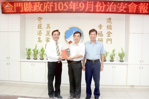 金門縣政府昨(22)日召開105年9月份治安會報,副縣長吳成典轉頒內政部104年度推動社區治安工作評鑑治安社區一般組優等獎獎盃與獎勵金給金沙鎮忠孝新邨社區。他肯定忠孝新邨社區的努力與績效;並強調,治安是社會發展的基礎,社會進步後很多偶發、突發事件很多,希望持續提昇應變能力。 副縣長吳成典指出,治安是社會發展的基礎,金門治安基本上都在八十分以上,但社會進步後,很多偶發、突發事情很多,警察單位、消防單位也好,應變能力的提昇也相對重要,因為時代變化太快了,但警察的素質最整齊、理念最清楚,動員速度最快,希望充分發揮這種精神,為地區的發展一起來努力。 他也提到,他在臉書上鼓勵大家講好話、做好事、多鼓勵、少責罵,因為人難免會犯錯,多鼓勵勸勉改進,良性的批評是為了要更好,希望大家互相鼓勵,讓社會更祥和發展。 縣警局局長許慶豐指出,他在警界服務很多地方,金門治安的犯罪發生數總平均值比全國平均值低很多。其次,煙毒沒有被害者,和查緝的強度是相關連的,查緝次數多,刑案件數增加,會覺得件數成長,但是不去查緝,就沒有件數,所以,他要特別強調的是「地區的治安是相當平穩的」。 副縣長吳成典對於警方查緝毒品的作為表示肯定,他也說,查緝取締能收到嚇阻作用,以免治安惡化,預防工作非常重要的,希望地區治安一天比一天更好。