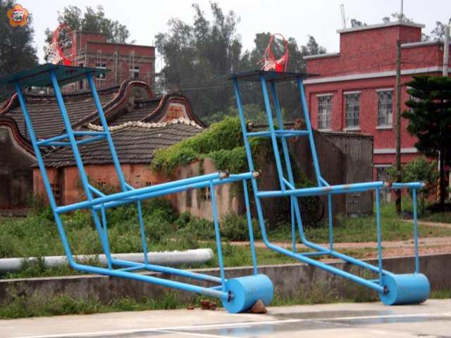 珊瑚颱風帶來強風豪雨,不僅造成部份地區電力中斷,也將不少路樹連根拔起,就連籃球架也被吹得四腳朝天! 昨第十號輕颱過境,帶來強風、豪雨,吹斷路樹、電線,造成部份地區電力中斷,而佇立在籃球場上的球架也招架不住了,被吹倒在地,四腳朝天。