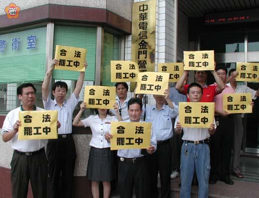 中華電信工會為抗議釋股案昨日發動罷工風潮,金門分會也隔海響應,工會幹部在金門營運處高舉「合法罷工中」海報,表達反對民營變成財團化,以及公務員身分和權益未獲得保障的訴求與立場,過程平和,中華電信營業和通訊並未受到干擾。 上午八時三十分起中華電信工會金門分會員工一、二十人,在中華電信工會金門分會常務理事董國勝帶領下於金門營運處門口高舉黃底黑字的「合法罷工中」的海報,隔海相挺台北總會發動的罷工行動,引起許多前往申辦業務及繳交電話費民眾的圍觀。 昨日登記參加這項罷工的員工有二十九人,約佔中華電信金門營運處員工(七十五人)的二成六,而實際參與以工會幹部為主。董國勝表示,員工反對釋股,主要是反對民營變成財團化,以及公務員身分和權益未獲得保障,希望讓政府聽到員工的心聲與訴求。 不過,考量減少對一般民眾對外通訊時的困擾,金門分會員工的抗爭縮小打擊面,在表達訴求之餘,並沒有採取一人一通電話癱瘓電信通話的激烈抗議行動。而金門營運處在經理姜世榮坐鎮調度下,也啟動應變機制,包括金門營運處、金湖服務中心營業照常、機房作業和線路查修正常出勤與運作,民眾並未感受到不便。 也許,就如同工會幹部所說「金門地方小,大家都很熟,實在不願意因為罷工影響民眾權益。」,因此,整個罷工過程平和,地區中華電信營業和通訊都還相當順暢。
