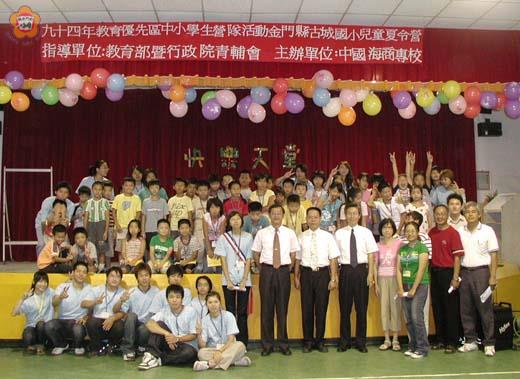 中國海事商業專科學校海童軍社同學昨日在該校教官王德瑞領隊下抵古城國小指導學生展開趣味盎然的兒童夏令營活動,在大哥哥、大姊姊精心設計的各項寓教於樂的活動中,大手牽小手,彩繪兒童金色童年,為漫漫暑期留下難得的歡樂回憶。 由教育部、青輔會指導、中國海專主辦的這項九十四年教育優先區中小學生營隊活動金門縣古城國小兒童夏令營活動昨日起在古城國小展開為期兩天的快樂夏令營活動。 昨日的開訓儀式中,古城國小校長吳水澤除了感謝中國海專海童軍同學來校帶給同學在暑假期間有一個充滿知性、感性,及難忘、快樂的回憶,他也期許同學們學習中國海專的「乘風破浪、迎向希望的未來」的精神,勇敢面對人生的挑戰,追求自我的成長。 中國海專海童軍社表現相當出色,去(九十三)年獲教育部評選為特優社團、今年也評定為優等社團,昨日在該校海童軍二十二位大哥哥、大姊姊活潑、有趣的指導下,古城國小三至五年級三十位學生開心地從民謠童歌教唱、團康活動、科學益智遊戲、體能競賽、大地追蹤、金銀島尋寶、彩染拓印教學、孫叔叔說故事、才藝表演訓練、自我介紹訓練、童軍技能交流::等寓教於樂的活動中,有趟快樂的學習成長之旅,為暑假留下珍貴的回憶。 率團抵金的中國海專教官王德瑞指出,此次活動是為落實大專青年犧牲奉獻服務社會理念,展現積極及參與中小學輔導活動,以增進離島兒童五育均衡之發展,為偏遠離島兒童彩繪歡樂童年。 這項暑期兒童夏令營活動今日仍續進行一天的活動,今日晚間六時至七時並舉行成果發表會,屆時中國海專校長陳文喜、學務處課外活動組組長詹迪光、總教官陳志遠都將出席,與參與的學生共同分享兩天來的成果與歡樂。也歡迎家長、師生前往欣賞,共度一個愉快的夏夜!