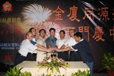 慶祝中秋佳節,金門慈湖海灘昨晚八時三十分起,與對岸的廈門市同步施放五彩繽紛的高空煙火,慶祝月圓人圓,璀璨的火樹銀花照亮了金廈海域。縣長李炷烽、立委吳成典和來賓們向在場及所有金門鄉親祝賀秋節快樂。 李縣長也期望透由兩門的煙火節目,用煙火代替過去兩岸的炮火,讓兩岸和平安定的建設發展。他也希望海內外金門鄉親在觀看這一輪明月,想到金門家鄉特別圓的皎潔明月,來關心家鄉,共同為金門未來美好的前途來打拚努力。 金門施放中秋煙火的地點是在湖下海堤,活動主題為「金廈同源流、兩門慶中秋」,廈門則是在國際會展中心舉辦「海峽月圓」晚會,煙火主題是「中秋月圓、海峽情深」,兩地隔海相望,距離約僅一萬公尺。這場中秋煙火晚會,也是繼二○○二年元宵節、二○○三年和二○○四年中秋節、今年九月七日的慶祝九八中國國際投資貿易洽談會舉辦,金廈兩門第五度隔海施放煙火,也是小三通後連續第三年中秋節隔海舉辦煙火秀。 昨晚的兩岸同步高空煙火,於晚間八時三十分同步施放,吸引大批鄉親前往慈堤觀賞。包括縣長李炷烽、省政府秘書長翁明志、立委吳成典、金寧鄉長李文俊、以及贊助活動的金酒公司董事長李榮文、台電金門區處經理邱清泉、和中油公司金門營業處代表等來賓與鄉親一同分享慶中秋的喜悅,也祝福所有鄉親都有個快樂的中秋節。 李縣長致詞時表示,今年家鄉的月特別圓,相較於台灣近來災害連連,如副總統呂秀蓮所說,是國不泰、民不安;風不調、雨不順,金門可說是風調雨順、國泰民安,這是金門鄉親精誠所至、團結和諧所致,媽祖也兩度來金巡安,這一切都是鄉親誠意的福報,也感謝關心金門的中央官員和所有金門鄉親。 他也表示,這幾年來,都會在慈堤與廈門同步舉辦施放煙火,用煙火來代替炮火,表達人民的心聲,因為沒有一個人願意戰爭,並且唾棄戰爭,而逃避戰爭最好的方法是與過去的敵人來交朋友,不要老是停留在過去的思維,以過去的觀念來看待近在眼前也在急劇改變的中國大陸。他說,台灣政府經常說大陸在打壓台灣,他覺得中國人最大的修養是伸手不打笑臉人,只要中國人都有情懷,只要在自己的土地上,用目前國家的自由、民主人權的制度,好好經營自己內政、關心經濟與社會福利,相信兩岸之間的隔閡會消除、很多誤解也會消失,金門的安定發展是指日可待。 李縣長也表示,廈門市委書記來信表達兩門之間進一步加強交流與交往的決心與誠意,並表示在適當的時機,假如台灣當局同意申請,他願意親自到金門。 在眾多鄉親的期待,縣長李炷烽等來賓共同按鈕下正式啟動煙火秀,今年中秋煙火節目有,「中秋佳節共歡慶」、「薄海歡騰同喜悅」、「兩岸同心齊祝福」、「萬象更新新希望」、「花開富貴獻祥瑞」、「百花競豔爭風采」、「星月爭輝耀寰宇」、「霞雲千里映穹蒼」、「步步高陞躍龍門」、「錦繡金門大中華」,施放過程搭配熱門音樂,為高空、低空與特效三合一煙火饗宴。廈門也是採取高、中、低空燃放煙火相結合的方式,分三個樂章進行,分別是「花好月圓」、「海峽同樂」、「華夏騰飛」,與金門隔海共同打造璀璨的中秋夜。在觀眾讚歎聲中,一道道燦爛火花,令人目不暇給,現場驚呼連連;三十分鐘煙火施放,每個節目煙火的密度、花色,令人嘆為觀止,以雷霆萬鈞之姿現身慈堤夜空,璀璨煙火,讓觀眾大開眼界,大呼過癮,許多人也不錯過捕捉美麗銀海的畫面,相機快門按個不停。 隨著皎潔明月、亮麗煙火秀和優美音樂,為金門鄉親提供一場聲光十足、與眾不同的中秋夜晚。 由於大批觀賞的人潮,警方也動員義警、義交協助疏導交通,整個煙火秀畫下句點後,金寧鄉公所環保人員也辛苦的清理現場的垃圾,還給慈堤沙灘美麗的面貌。