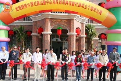 斥資新台幣二千多萬元興建的金城鎮前水頭社區活動中心,昨日在福建省政府主席顏忠誠、縣長李炷烽等人的剪綵下正式啟用,透過社區活動中心的興建凝聚社區向心力,使社區更為蓬勃發展,同時提供村民一處休閒康樂及完善教學環境等多功能場所。 這座號稱全縣一百六十三個村莊中首屈一指的金城鎮前水頭社區活動中心,昨日上午九時許舉行社區活動中心落成啟用暨社區十週年慶活動,典禮由金城鎮長蔡輝詩主持,省府主席顏忠誠、縣長李炷烽、省府秘書長翁明志、縣議員許華玉等來賓應邀參加剪綵,台電金門區處經理邱清泉、金門港務處長張國土、縣文化局長李錫隆、古城國小校長吳水澤、金城鎮代會主席陳天成及社區長老與社區鄉親到場參加、觀禮,社區居民也熱絡參與。活動中也安排古城國小鑼鼓隊、祥獅獻瑞演出,為活動增添熱鬧的氣氛。 省府主席顏忠誠表示這棟建築算得上地區最大、最高、最美的活動中心,其功能將提供社區居民學習活動最好的場所,是凝聚鄉親向心力的好地方。他說水頭這地方可說是金門的頭,水頭的發展將帶動地區的發展繁榮,尤其水頭商港完成後,地區的貨物進出都要經過水頭,加上周圍的景點與閩南式建築,可見水頭未來前途發展是非常光明遠大。 縣長李炷烽認為該活動中心是全台灣首屈一指的活動中心,參與貴賓冠蓋雲集,充分顯示水頭鄉親親切與社區豐沛的人脈。他說,前水頭社區向來有「有水頭富,無水頭厝」的雅稱,擁有豐富的人文與歷史,社區活動中心工程順利完工,帶動水頭社區興旺發達,開創社區發展新里程碑。李炷烽也誇讚議員許華玉為社區活動中心的興建極力奔走,終於有成,相當值得效法。 省府秘書長翁明志、台電金門區處經理邱清泉、鎮代會主席陳天成等也相繼致詞祝賀,肯定社區居民有錢出錢、有力出力,自發性籌資興建活動中心的精神,並希望藉由社區活動中心的啟用,提供一處休閒聚會的場所,凝聚社區向心力,促進社區的整體發展。 議員許華玉感謝議員、縣府、省府、鎮公所等單位的支持,及鄉親的熱心投入與贊助,讓水頭社區活動中心完工成為水頭商港的地標,並兼具教育、資訊等功能,也成為地區模範社區活動中心。許華玉表示該社區平日以敦親睦鄰並結合里辦公處辦理促進社區和諧和計畫聯誼活動,均與居民生活息息相關,屆時落成啟用更可強化居民對於社區的認同感,重新建立人文環境和提高社區居民向心力,營造更團結和諧同心社區。 金城鎮前水頭社區活動中心,位於前水頭聚落西北處,南側為金水寺,西北側已規劃為水頭商港,西、西南側有台電塔山電廠及中央氣象局興建中的金門氣象站。工程基地面積1456.69平方公尺,建築面積490.90平方公尺,於九十二年二月十七日開工,該新建工程總經費達新台幣二千七百八十四萬元,整體建築以三樓建層規劃,其中,一樓建築面積約為四百九十一平方公尺,規劃為儲藏室、室內運動場所、多媒體會議廳、較大型洗手間及電梯、室外廣場及出入口。二樓樓板面積約為四百八十平方公尺,為室內活動室、聯合辦公室等。三樓樓板面積約為四百零五平方公尺,有研習教室、社區文物展示室、圖書閱覽室等,樓頂為斜屋頂及觀景台。