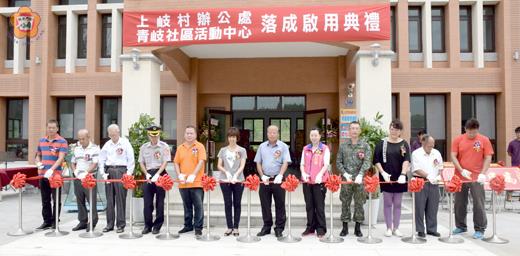 上岐村暨青岐社區活動中心落成剪綵啟用典禮,昨日舉行,烈嶼鄉長洪成發、議長洪麗萍、議員洪鴻斌等來賓共同剪綵,分享社區的喜事。青岐照顧關懷據點也掛牌運作、岐心志工隊也「成軍」,投入社區的服務工作。 上岐村辦公處結合青岐社區活動中心的建設案,已竣工。雖然強颱莫蘭蒂的攪局,大小交通船停擺,大金門多位來賓的行程受阻,社區還是照常於昨日上午十一時舉行剪綵啟用儀式,由烈嶼鄉長洪成發、議長洪麗萍、議員洪鴻斌、鄉代會主席洪若珊、副主席洪燕玉、調解會主席洪天映、上岐村長洪天南、青岐社區發展協會理事長洪正雄等人共同剪綵。鄉代表方水萬、吳福全、陳秀治、洪雅明、方駿洋、立委楊鎮浯烈嶼服務處主任洪學文、烈嶼各社區發展協會理事長、村長以及地方各界也到場道賀,青岐鑼鼓隊敲鑼打鼓的迎賓,村長洪天南、青岐社區發展協會理事長洪正雄、總幹事林宜蘭和居民也熱情的歡迎和接待客人。青岐社區舞蹈社帶來舞蹈表演,為活動拉開序幕。 鄉長洪成發指出,社區活動中心的興建,列為鄉務的重點工作,這幾年來,鄉公所協助社區進行整建或是新建,協助社區取得土地、經費問題以及辦理後續工程發包等作業,讓社區活動中心的建設案能夠順利推動,包括,陸續完成黃厝、湖下、羅厝、東林、東坑社區的建設,相繼啟用,上林、上岐兩地結合活動中心、村辦公處的多功能場所,在上林活動中心啟用後,上岐也順利啟用,今年繼續執行上庫社區活動中心的建設,並繼續推動后井、后頭社區活動中心規劃案,努力讓每一處社區都能擁有新穎完善的社區活動中心,服務鄉親。 議長洪麗萍也期望社區每一處社區活動中心都能發揮最大功能,提供居民更多功能的用途,完善的活動聚會場所又兼具休閒功能的空間,服務鄉親,提升居民生活的品質。來賓也祝福該社區愈來愈有發展,分享居民的歡喜心情。 該社區新建活動中心啟用,青岐照顧關懷據點也掛牌運作,投入服務社區內的銀髮族和獨居老人的關懷和照顧服務。岐心志工隊首任隊長林淑萍和一群志工夥伴們秉承著社區服務的精神,結合社區發展協會幹部,一起努力來讓照顧關懷據點發揮服務長輩的功能。 昨晚,該社區的中秋聯誼活動也受莫蘭蒂的影響而延期舉辦,居民希望颱風趕快過境,恢復正常的生活。